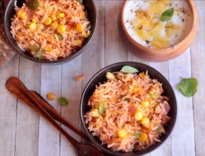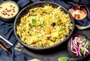 A mild spicy but flavorful Rice Pulao dish, that can be made in jiffy with limited vegetables. It is good to go with any raita, plain yogurt or even green chutney. Pack for picnics, potlucks and is definitely a party pleaser. There are very minimum spices used in this Pulao so it is definitely kids friendly and a good lunch box meal option.
