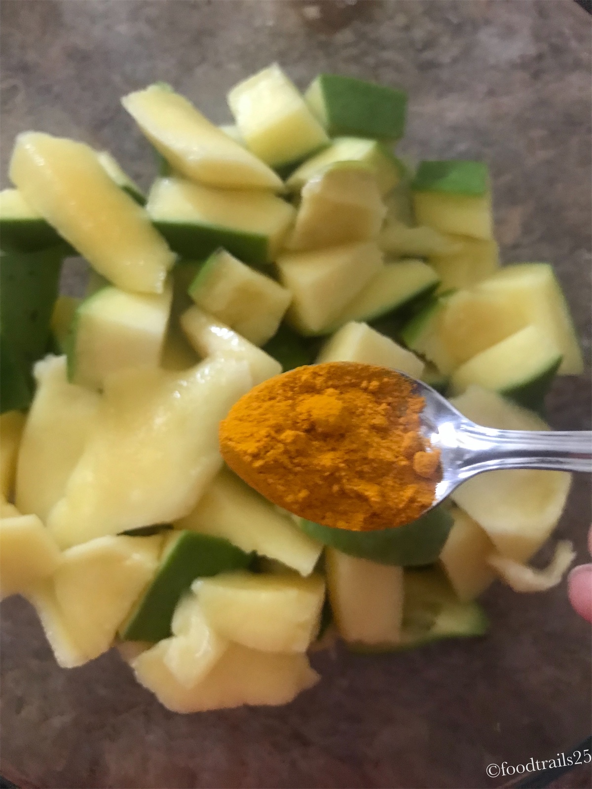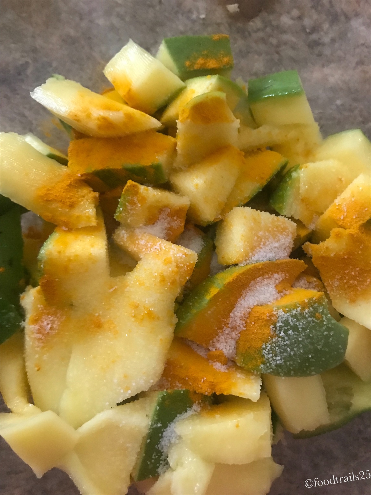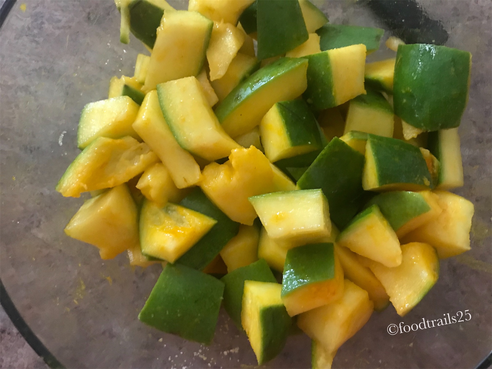 - Take mango pieces in glass bowl and add turmeric powder and salt, mix it nicely with mango pieces and then cover with a cloth or cling film and keep it aside for 7-8 hours. After that you will see, mango pieces will leave water.