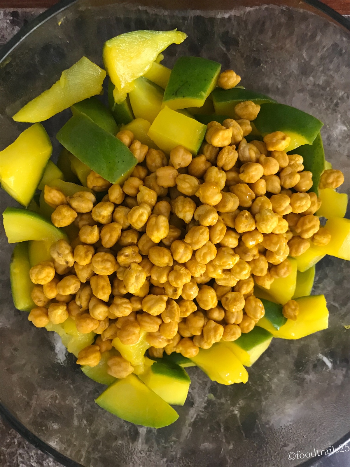 - Now take out the mango bowl from the refrigerator. You can dry it on a kitchen towel for 1-2 hrs or leave on the counter till it comes to room temperature. Then mix chickpeas and mango pieces together.