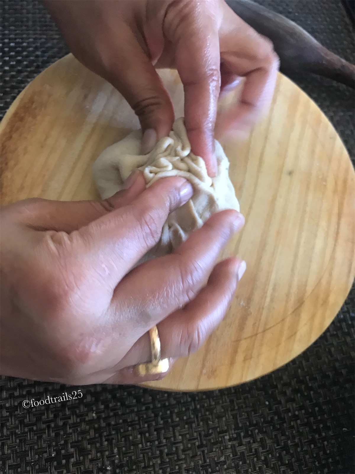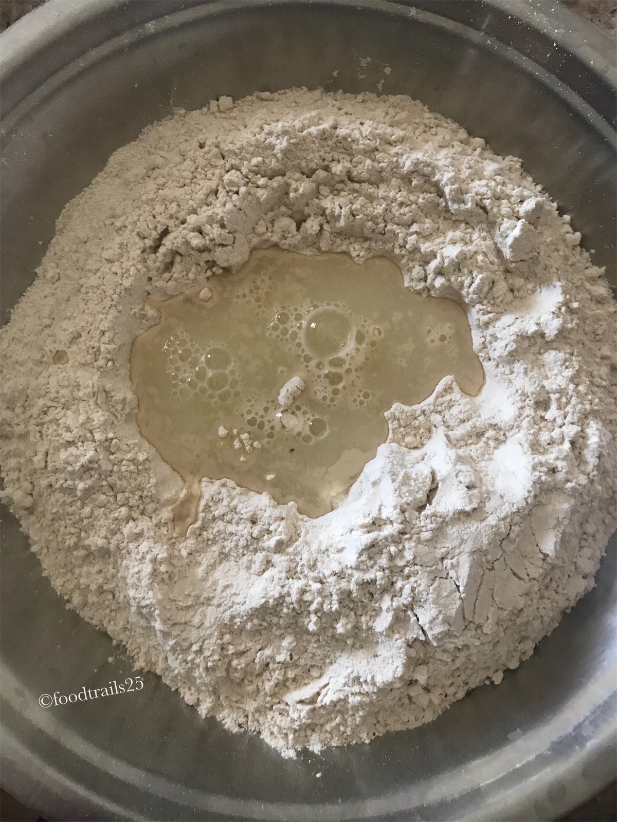 - Make a well in the center and add just enough water, slowly mixing the dough.