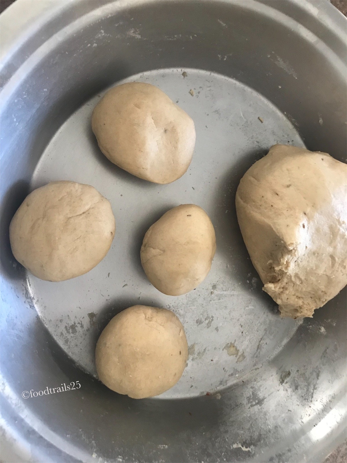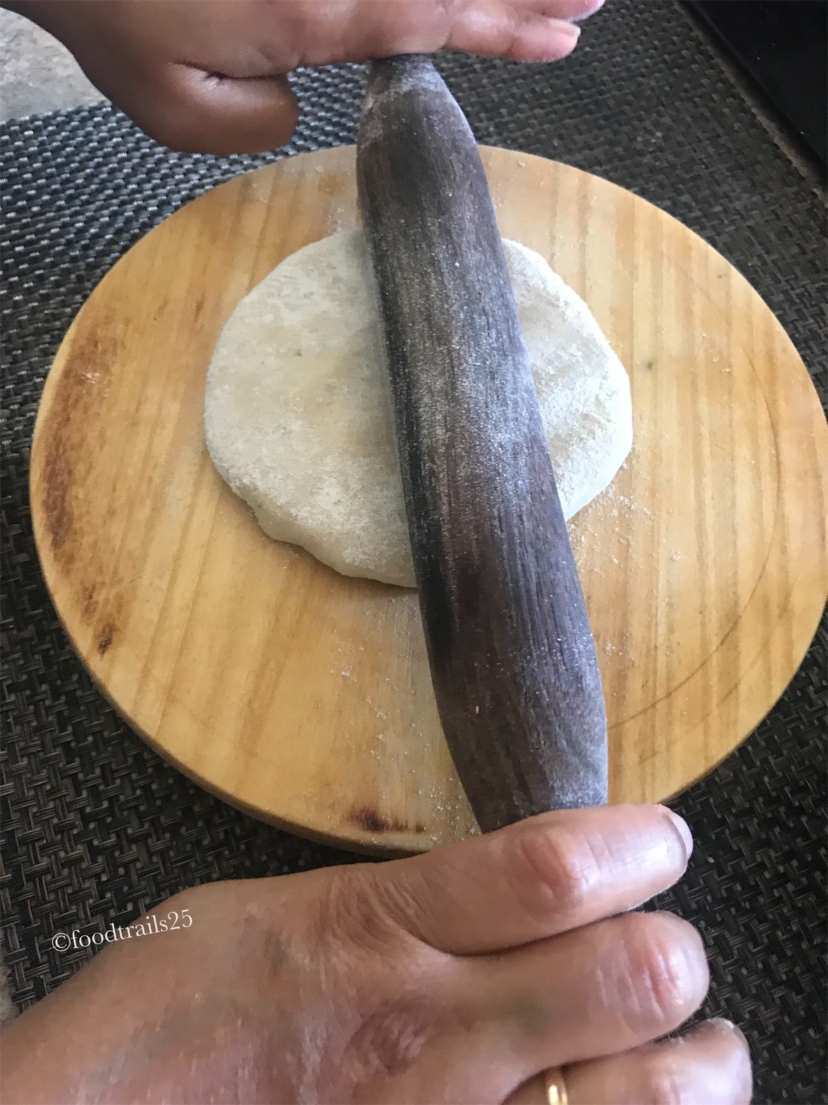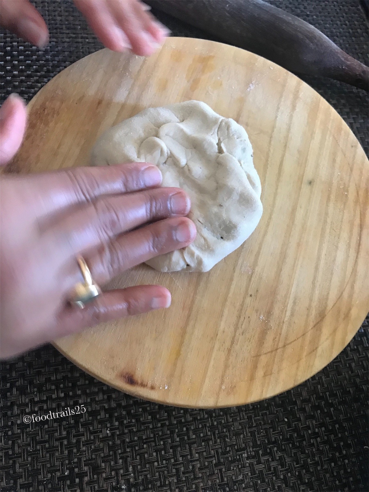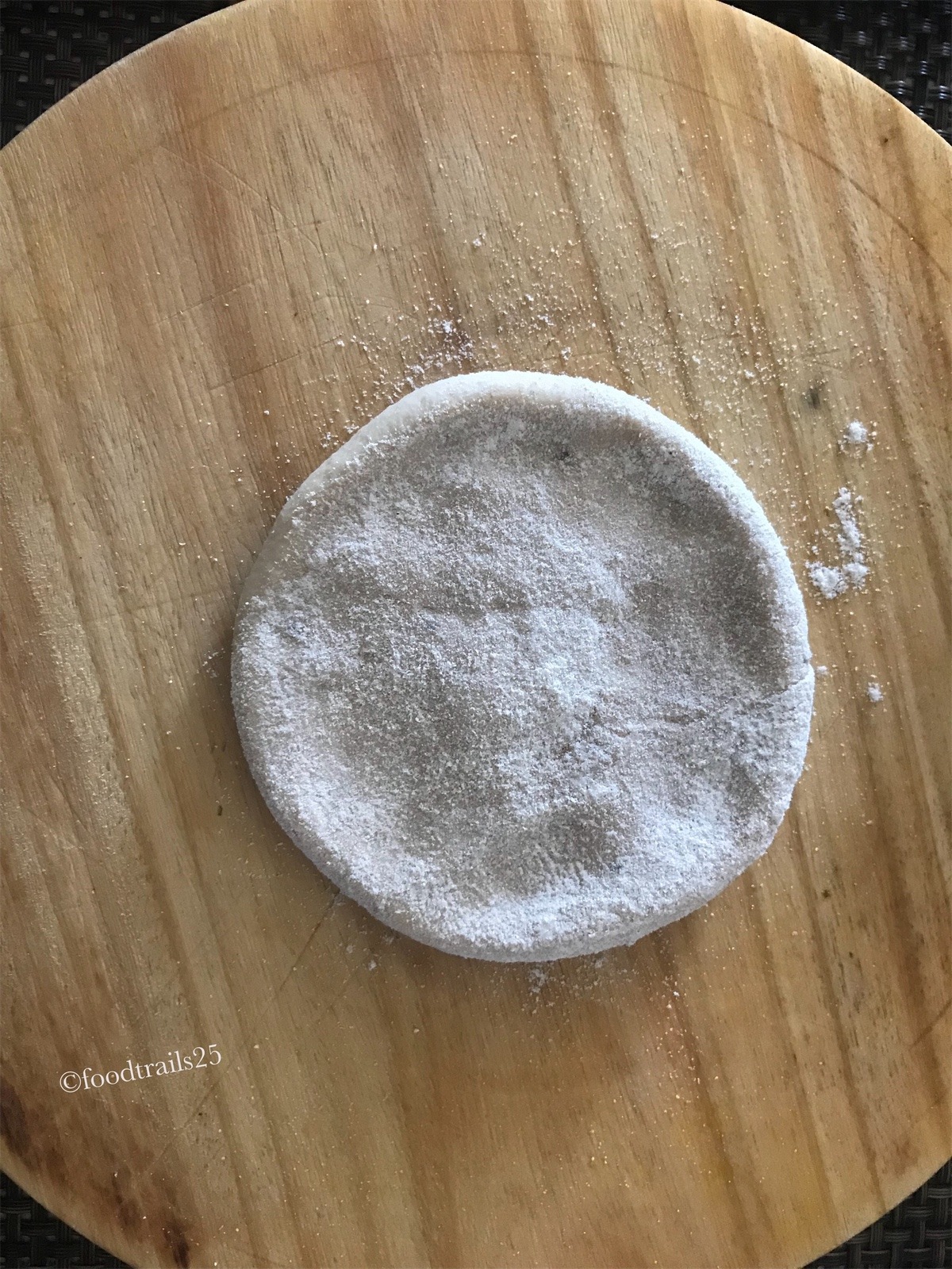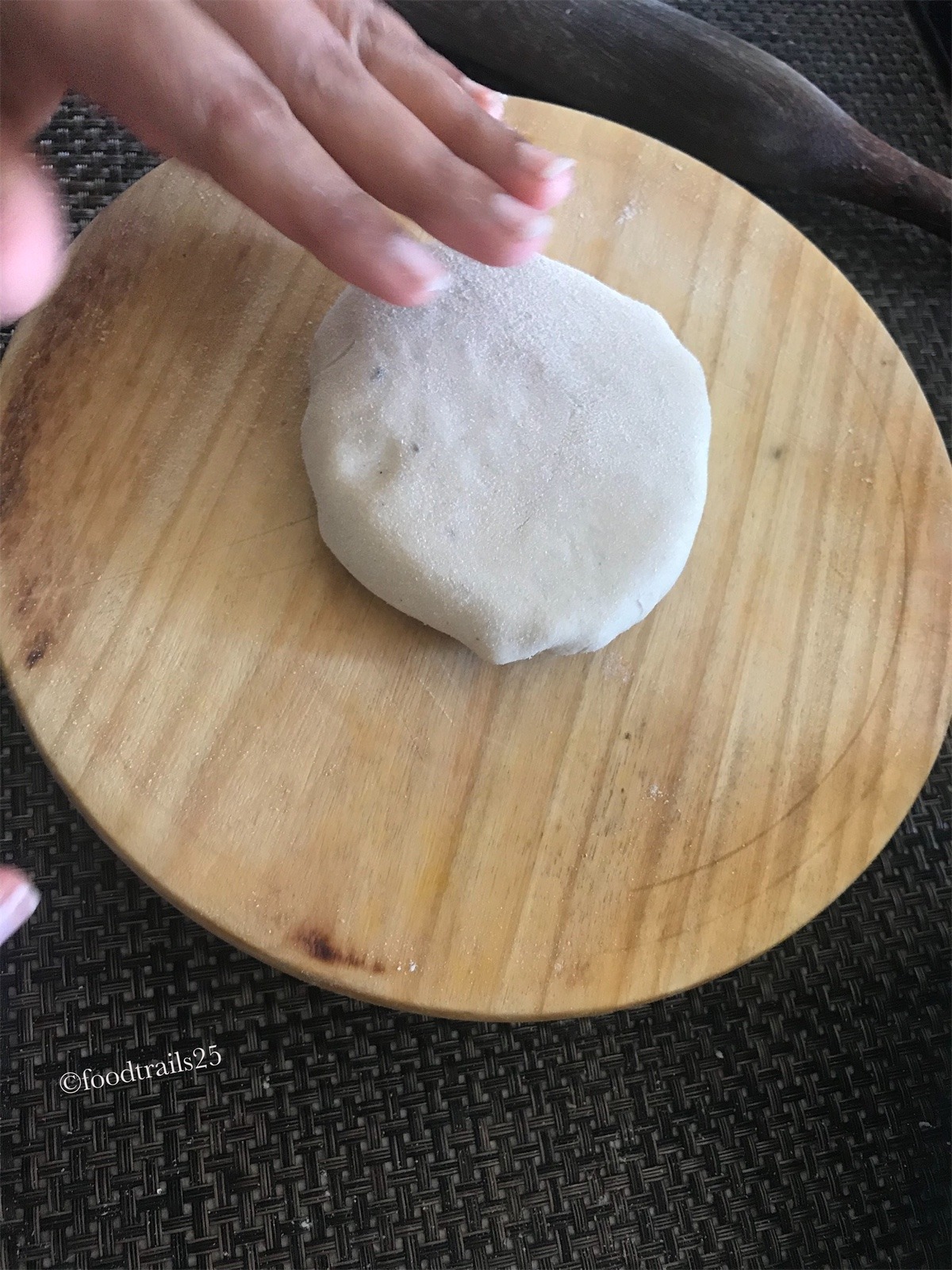 - Roll to a smooth ball.Pat some flour on it. Roll it or with your hands flatten into a small disc.