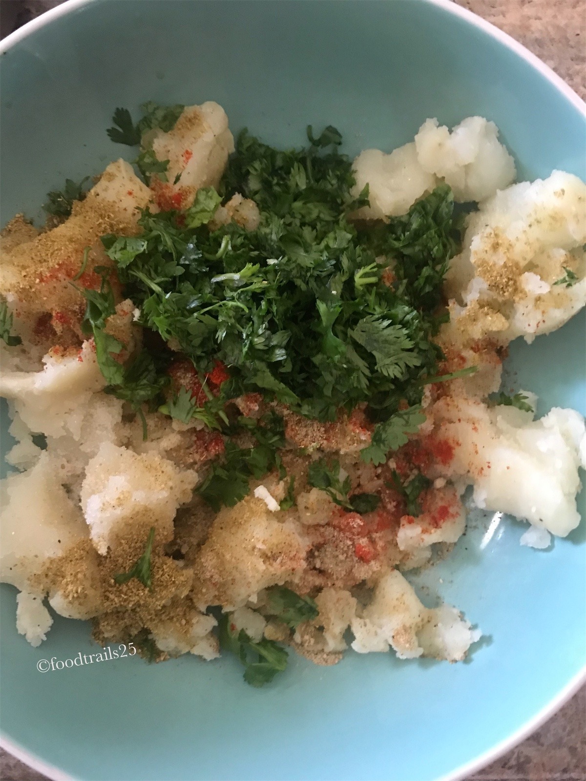 Just before starting with rolling paranthas, add spices (see the recipe card for details), finely chopped cilantro leaves and salt as per taste. Mix nicely.