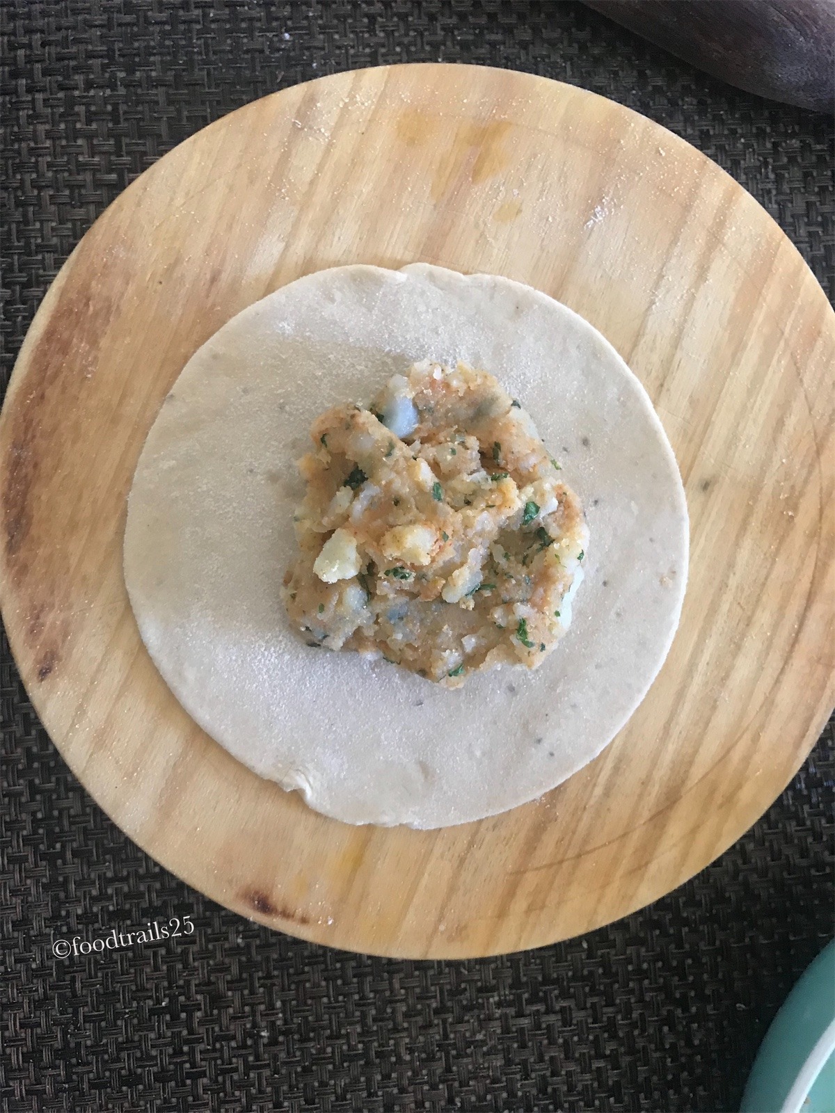 - Add the filling to it. Seal the edges and roll the disc to a circular disc of around 6" in diameter or depending on the thickness you want. You can use little flour to dust while rolling out parantha.