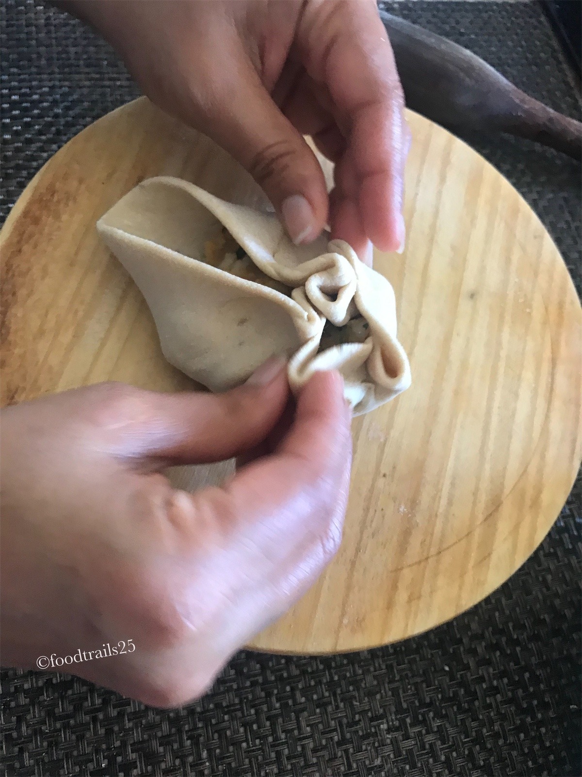 Take a portion of the dough roll it slightly to make a small flat disc(not very thin) , take enough filling for the portion and keep it in the center. Refer pics below.
