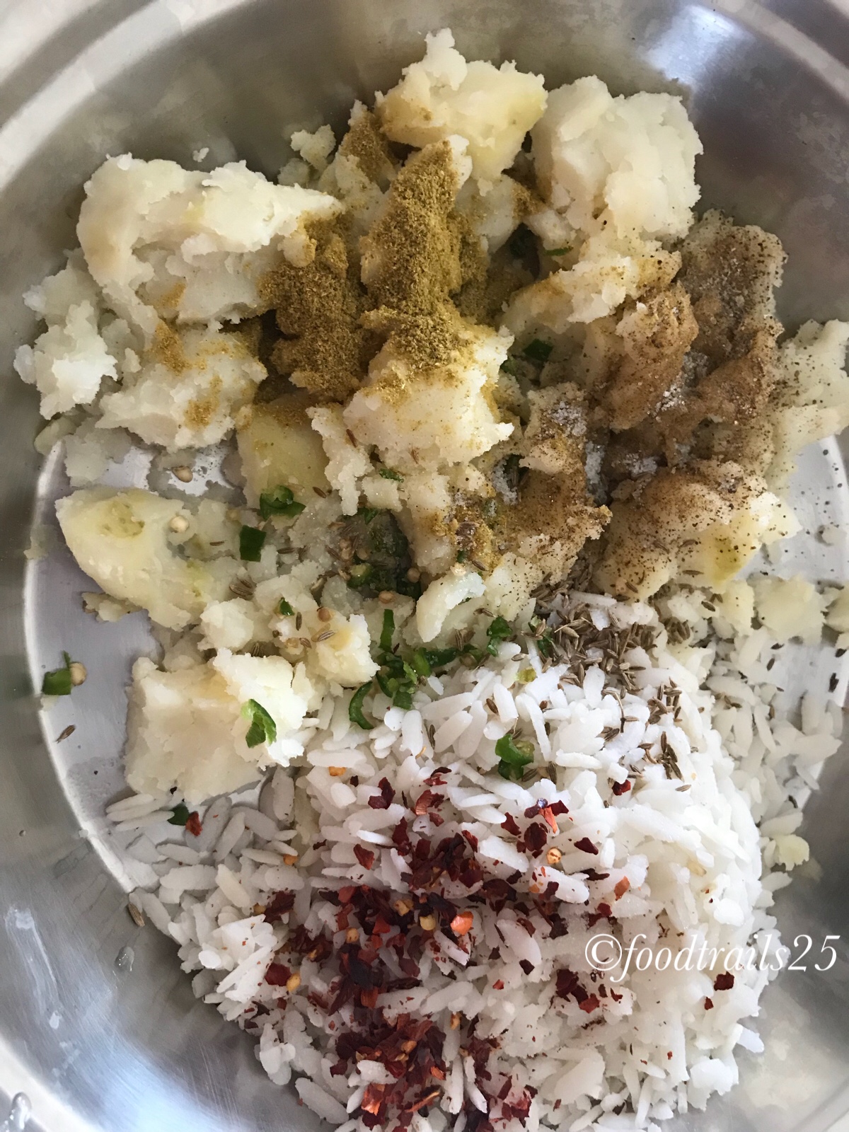 Mash boiled potatoes, add in soaked poha, finely chopped green chillies(optional), coriander and cumin powder, red chilli flakes, cumin seeds, breadcrumbs and mix nicely everything, divide into equal portions and give the desired shape like oval, round or flattened patty.