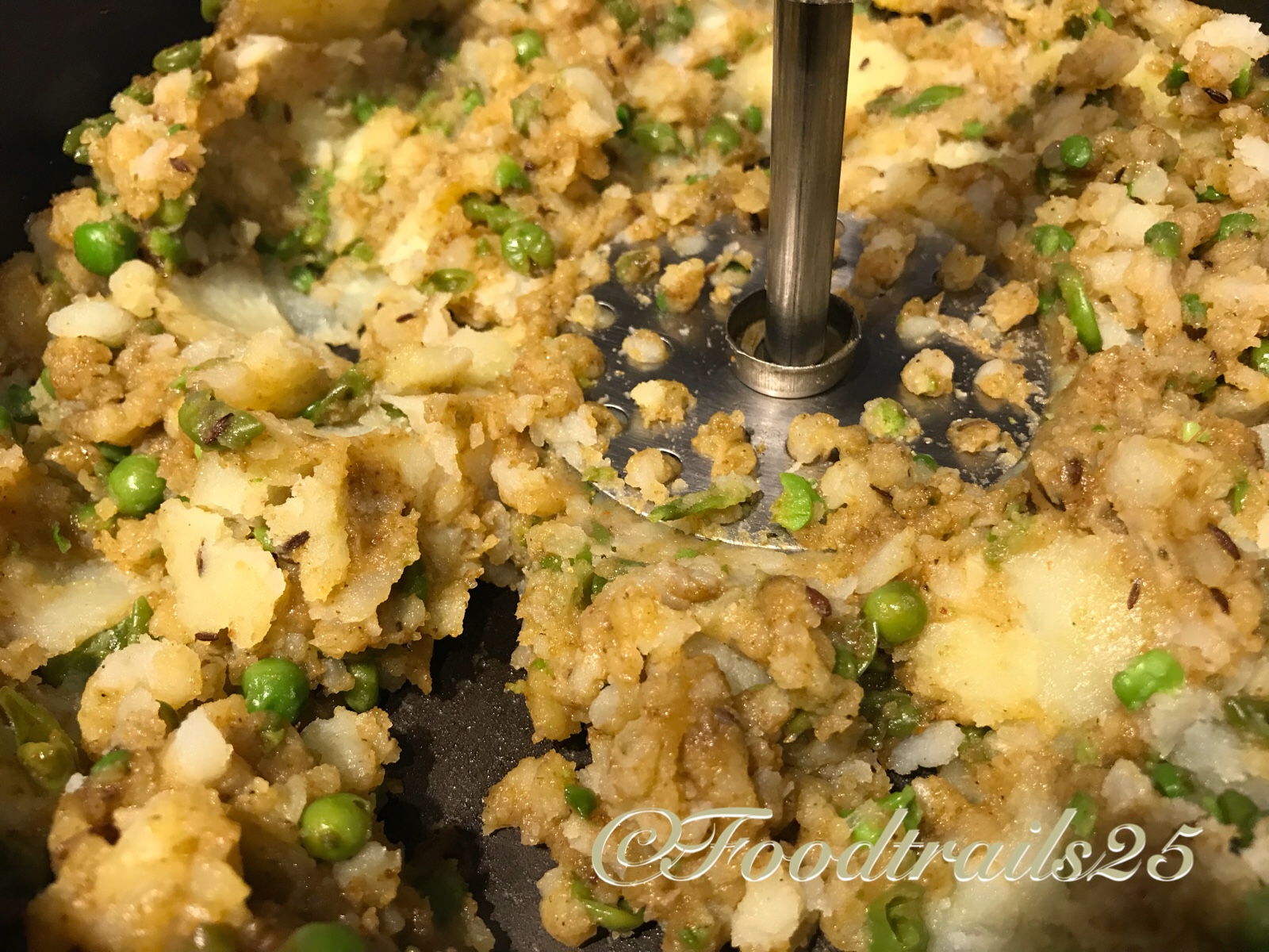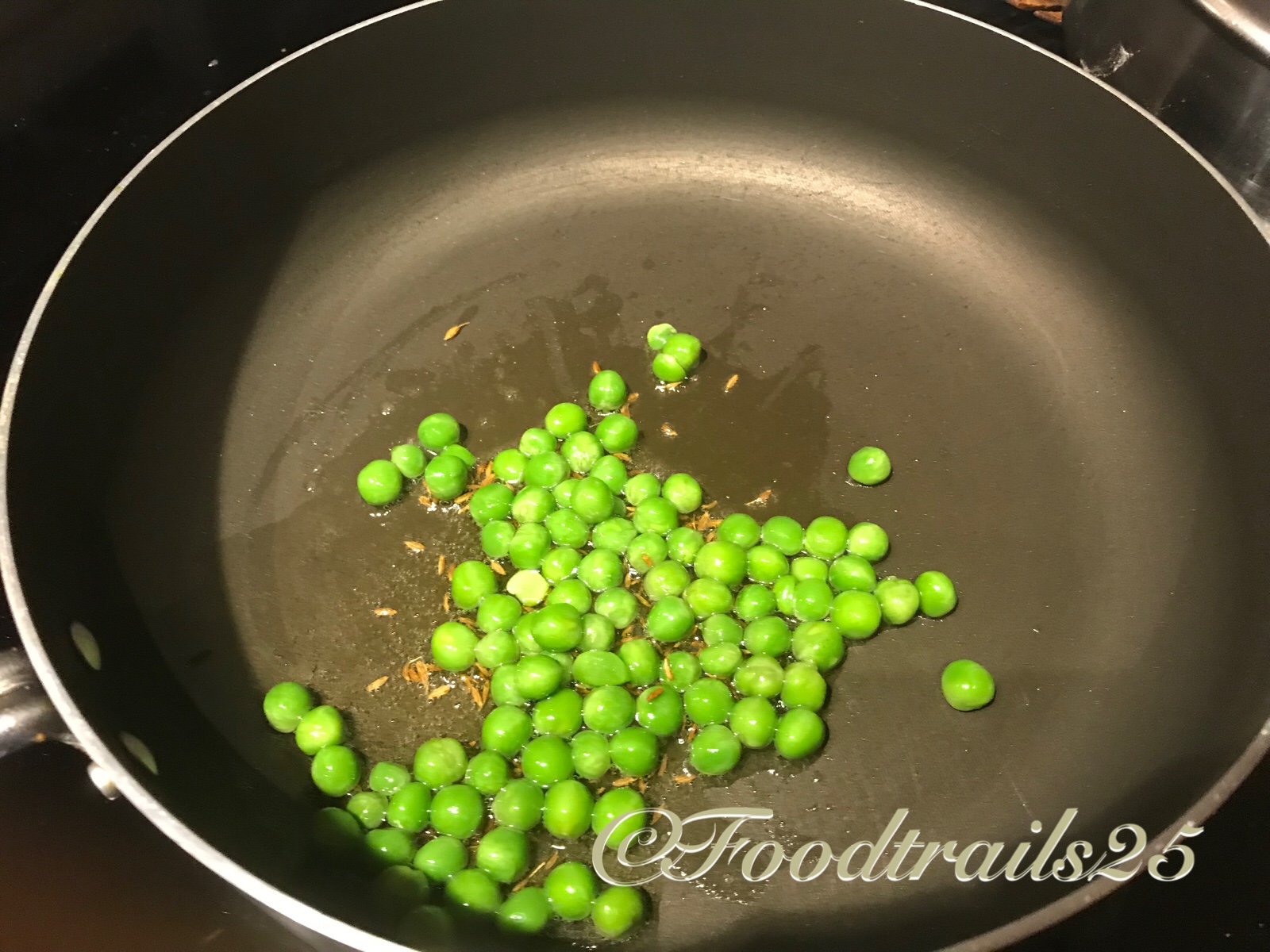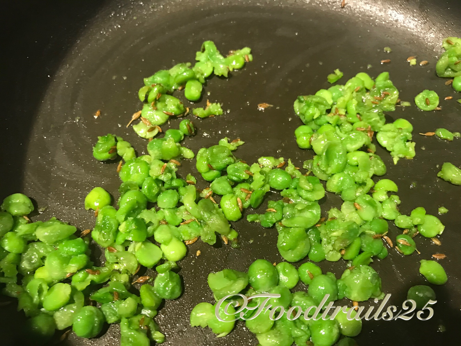 - In a pan heat oil, add cumin seeds once they are light brown, add peas and fry a little. Mash peas with a masher or wooden spoon.