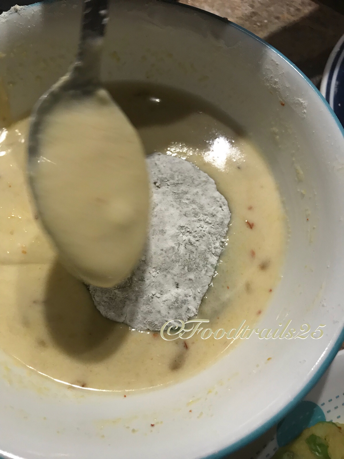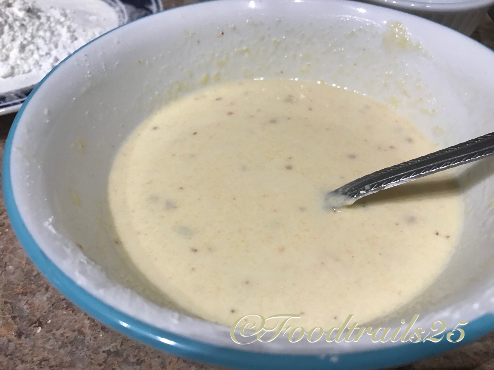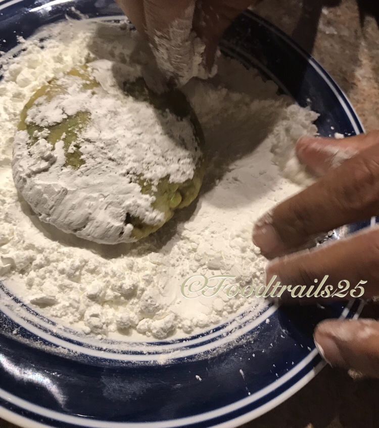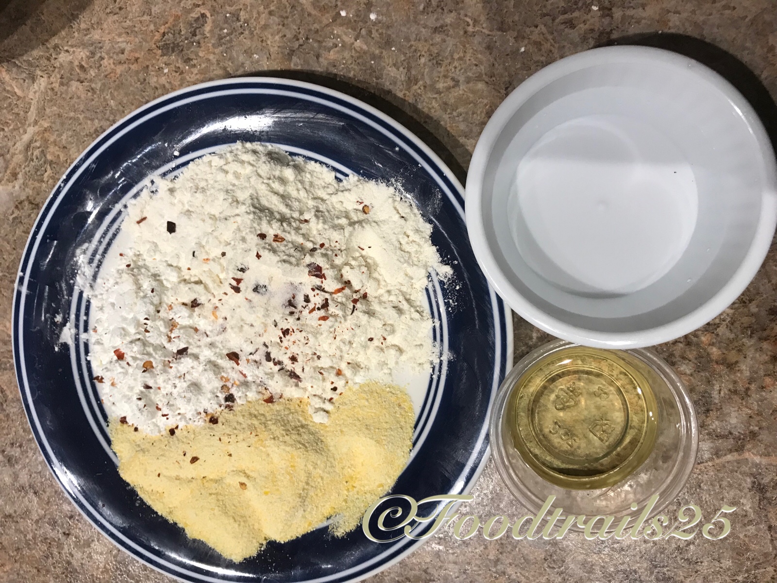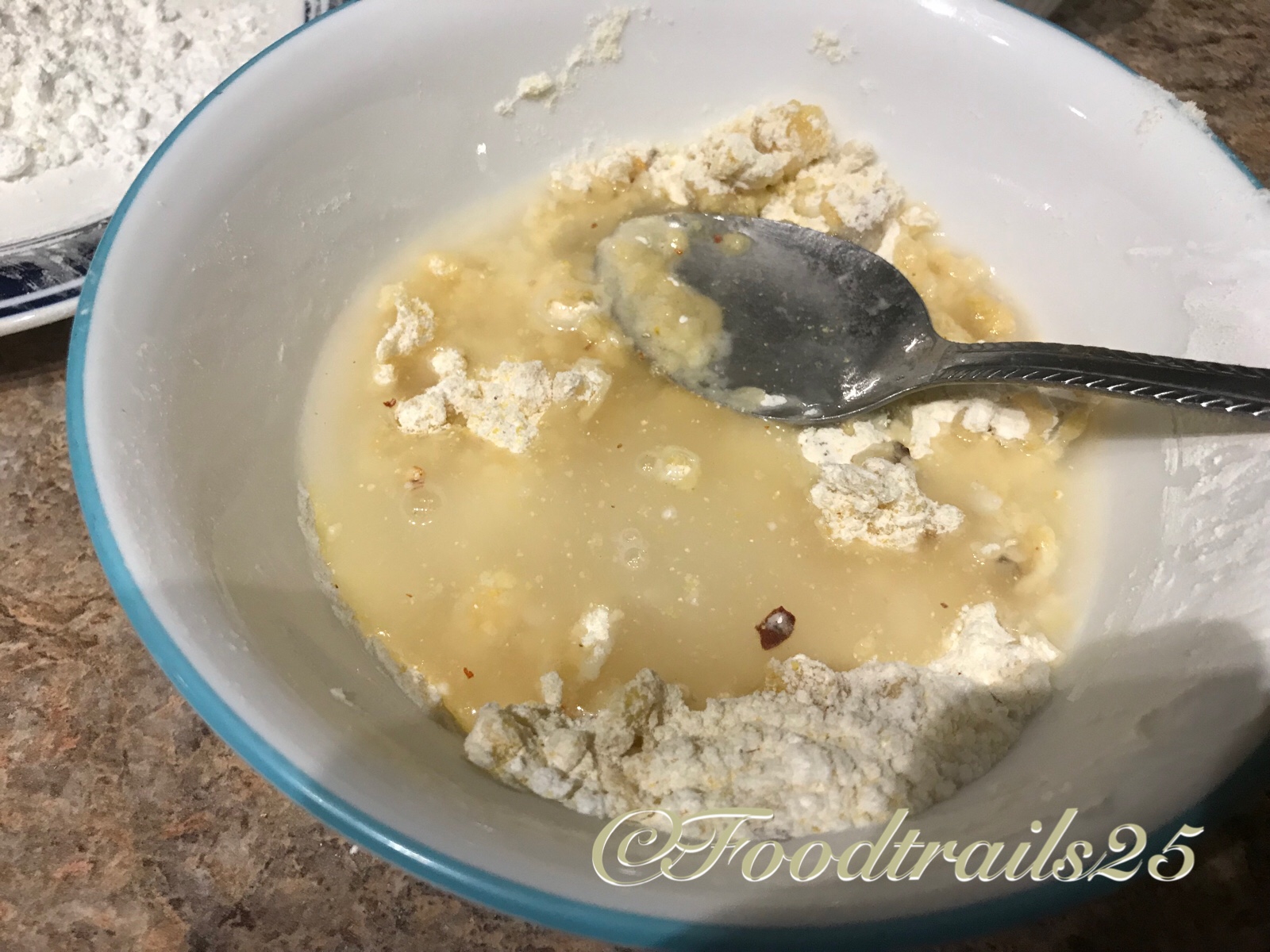 - Meanwhile, take 2-3 tbsp of cornstarch, 1 tbsp of cornmeal and make a slurry using 3-4 tbsp water. If the slurry is thick, add a tbsp of water or if it gets thick add a tsp some cornstarch accordingly. If you want, add few chill flakes to the slurry. Also in another bowl take 1-2 tbsp of cornflour with a pinch of salt for dusting patties.