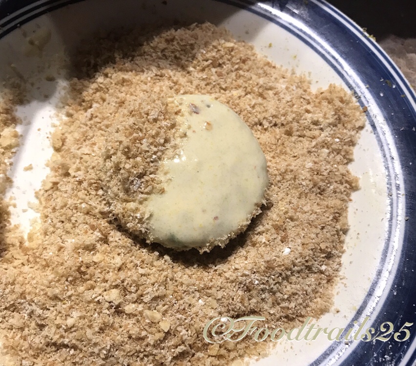 - Take one patty, dip into the slurry, transfer to the breadcrumbs mixture and coat it well. Press the breadcrumbs mixture nicely on the patty.