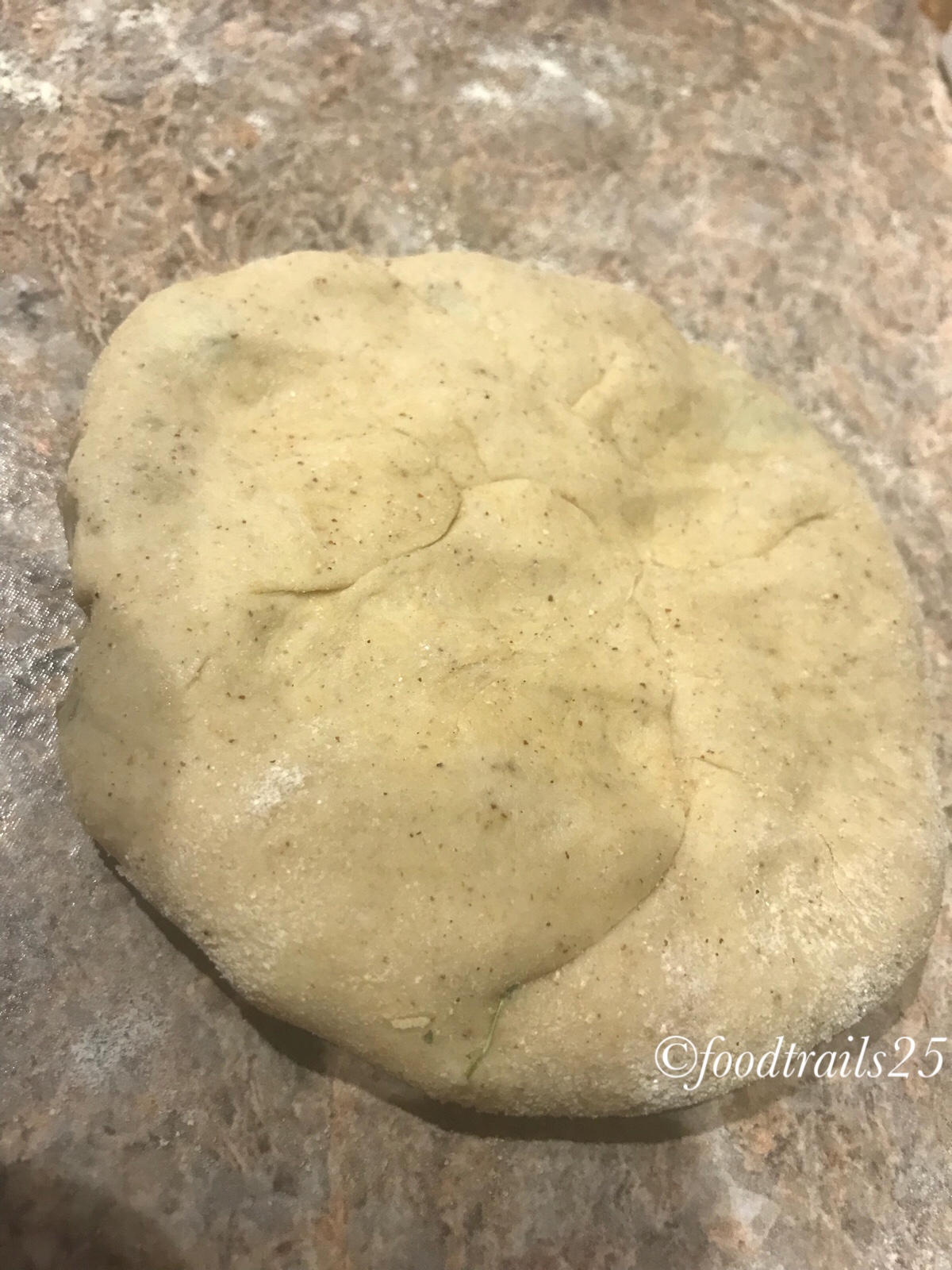 Leave the dough for 5 mins, and add a tbsp oil or butter, transfer dough on the well-floured surface and start kneading the dough. Knead it well for 5-6 mins till you get a soft and pliable dough. (Image for this step is missing below, will update soon)