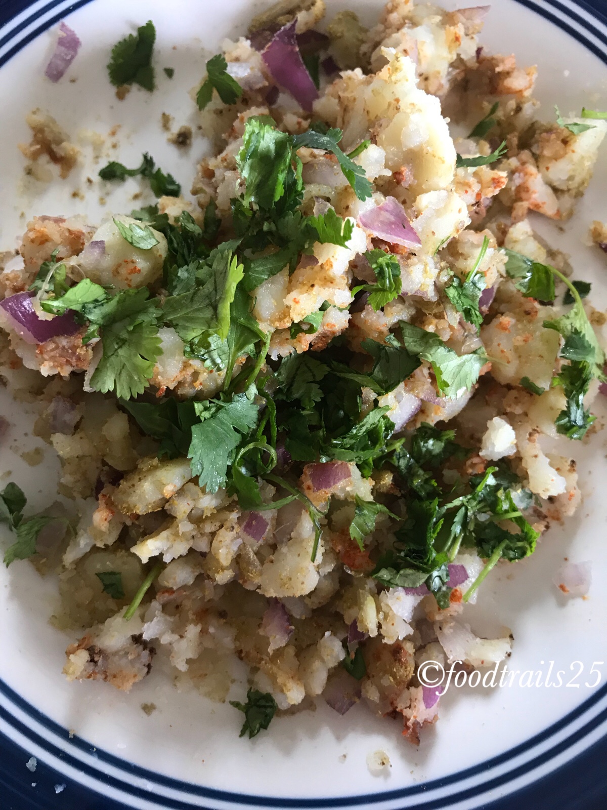 Mash potatoes and add chopped onions, green chillies and all the dry spices. Mix well and make the filling.