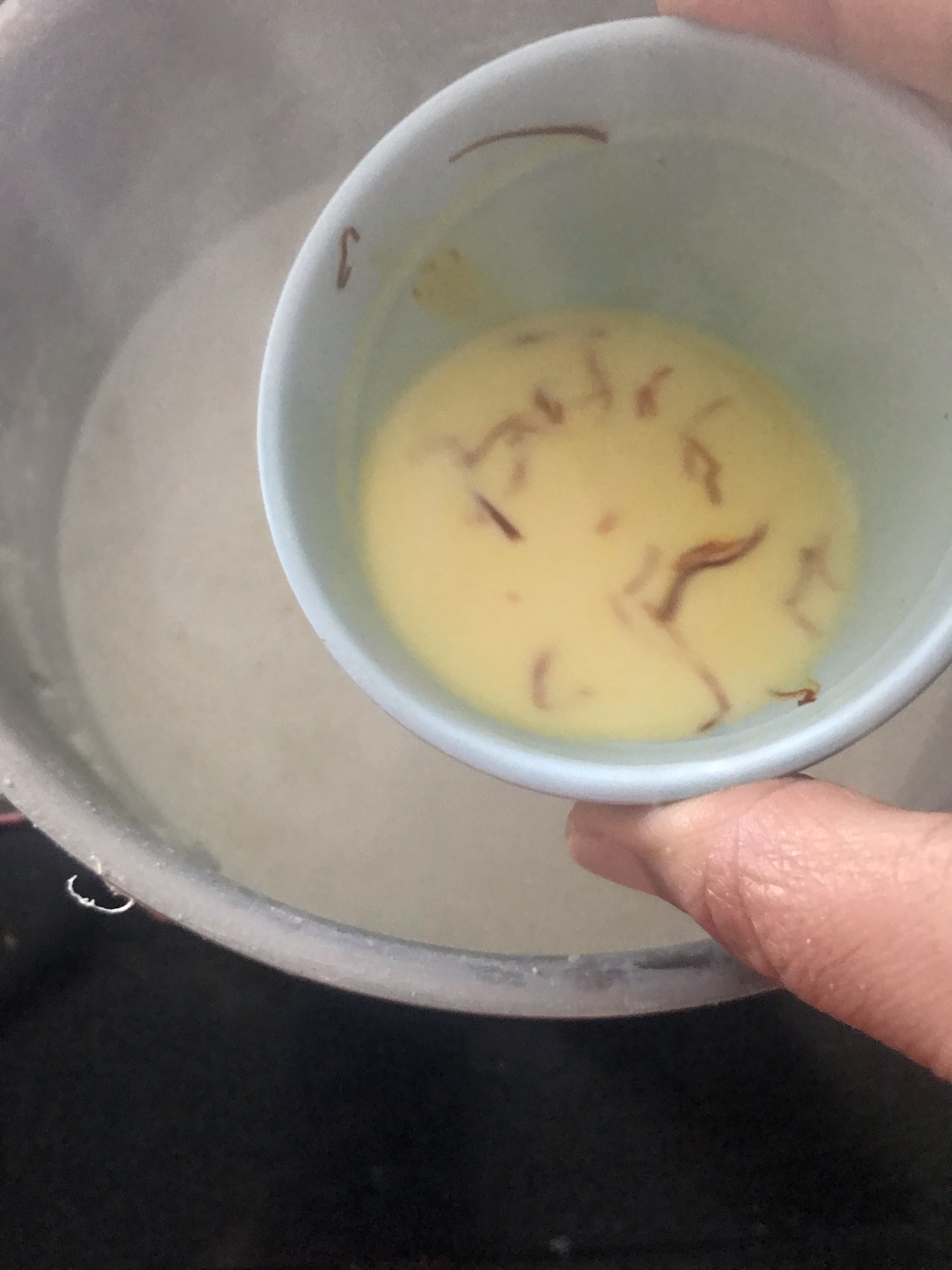 • Boil milk for 10 minutes, then add cardamom powder, rice paste and almond meal. Cook on low flame for about 10 minutes or till it starts to thicken.