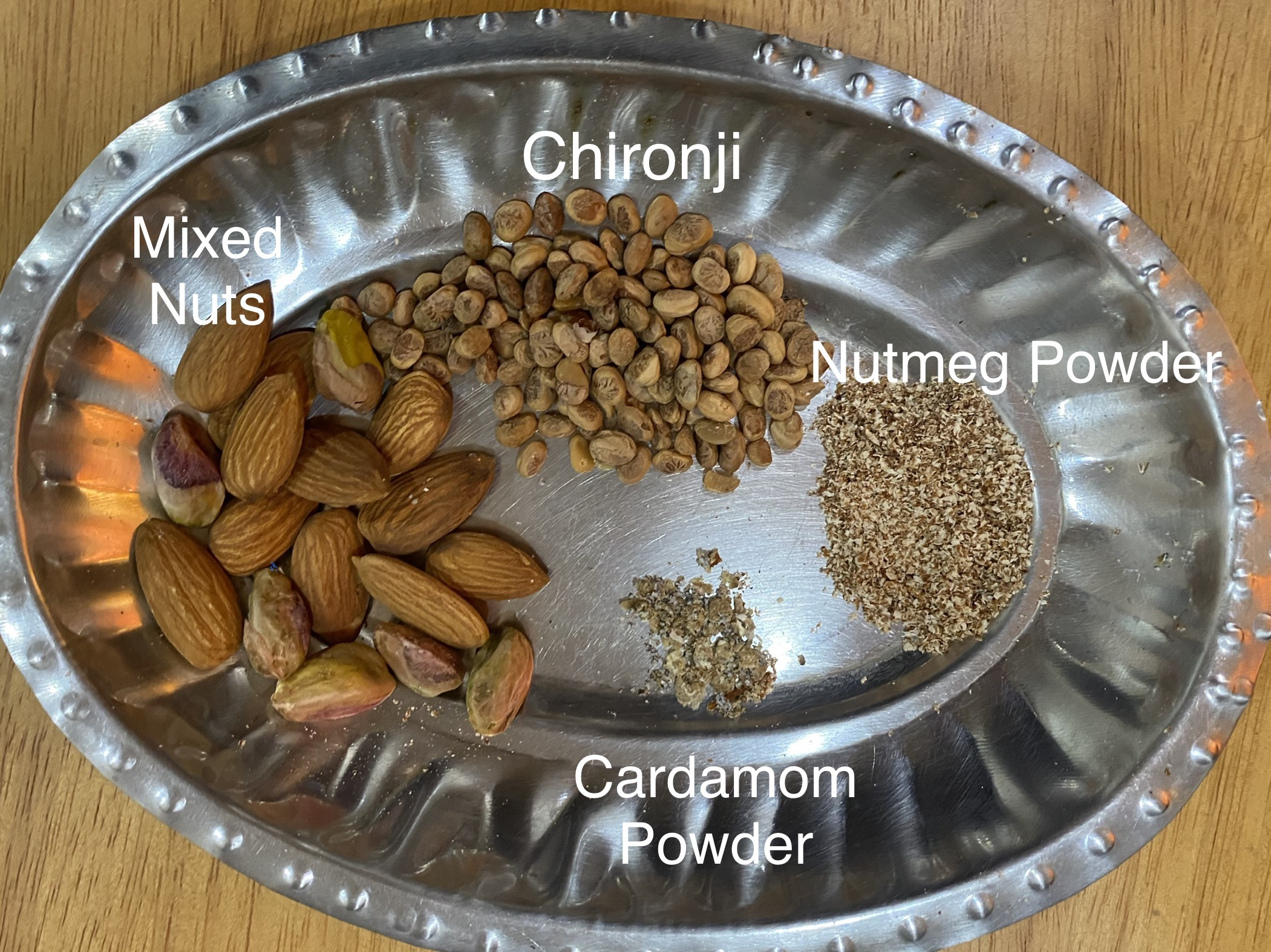 The dessert is flavoured with Nutmeg/Jaiphal and Cardamon/Eliachi powder.