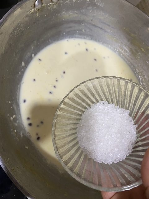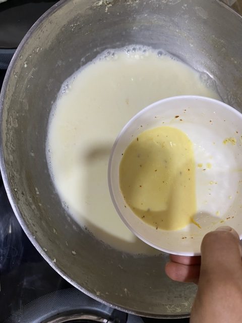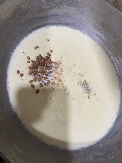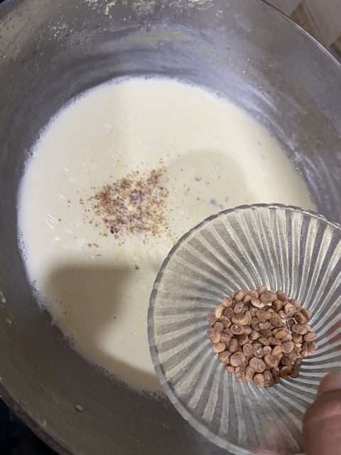 - Once milk starts to reduce and thicken, cardamom powder, nutmeg powder, chironji, saffron milk.