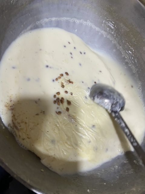Take a thick bottomed pan and cook milk on slow flame. Take care not burn milk at the bottom of kadhi or pan.