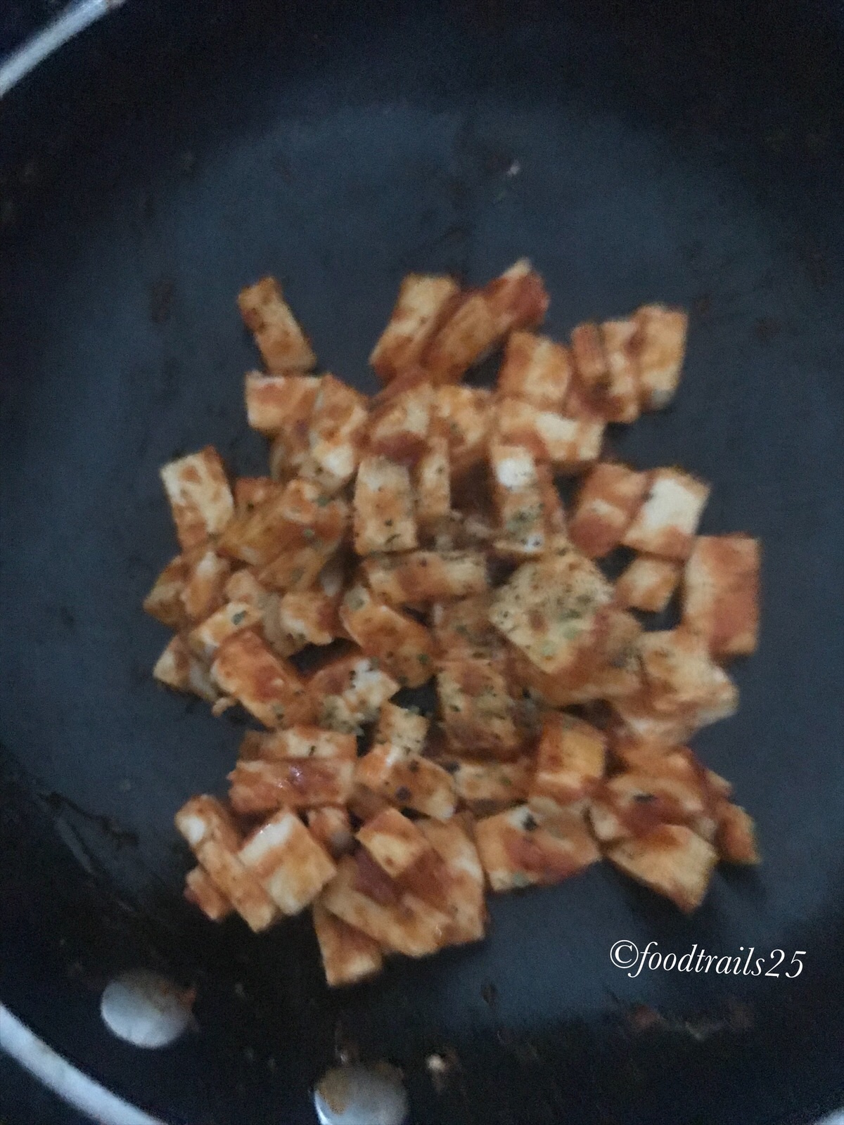 - Add paneer pieces and mix well in the sauce. Take care the sauce should not be too watery. We want semi-dry paneer filling.