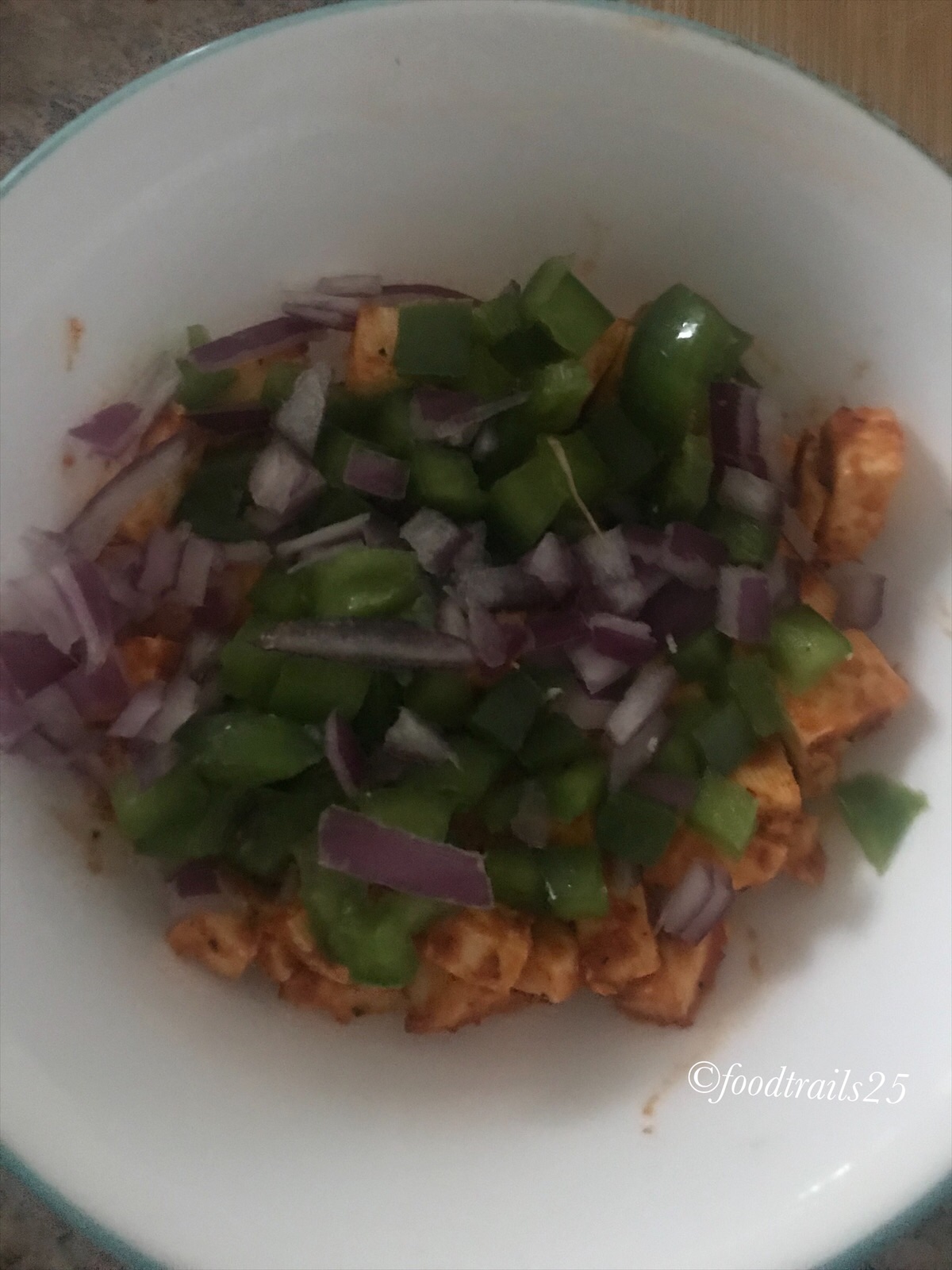 - Let the filling cool after that add chopped capsicum and onions., cheese and seasoning. Add salt as required.