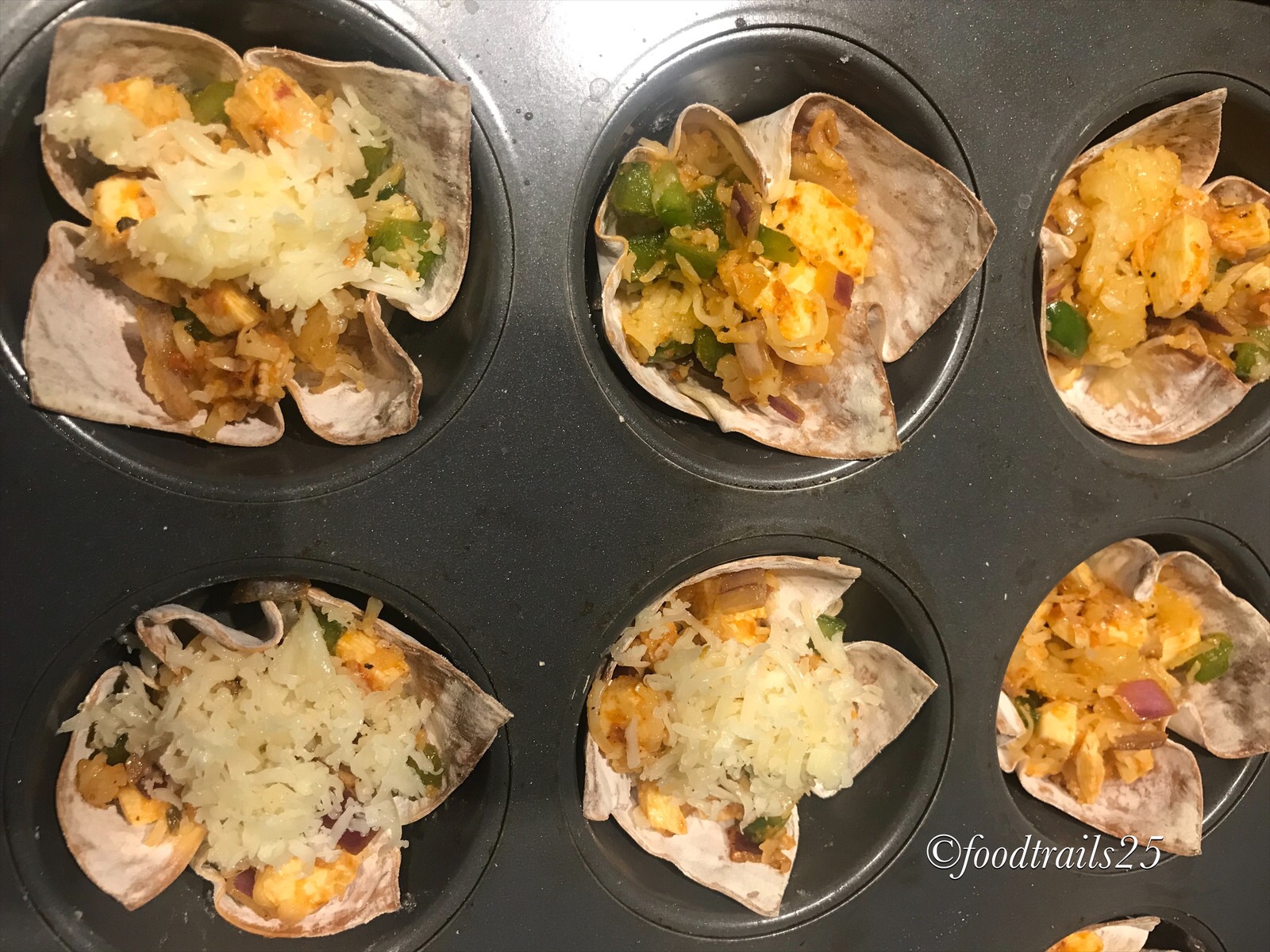 Wonton cups loaded with a easy Paneer(Indian Cottage Cheese) Makhani filling( quick recipe), with lots of cheese and onions and capsicum for the crunch. Prepare Pizza flavoured Paneer Makhani bites for in under 20 minutes with all the readily available ingredients from your kitchen. All you need to have are Wonton wrappers. Paneer/Indian Cottage Cheese used in the recipe can be homemade or store bought. For homemade paneer recipe click here... Homemade Paneer.