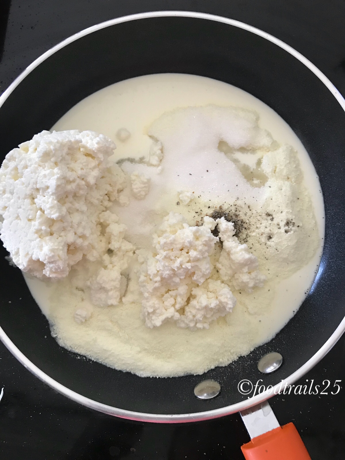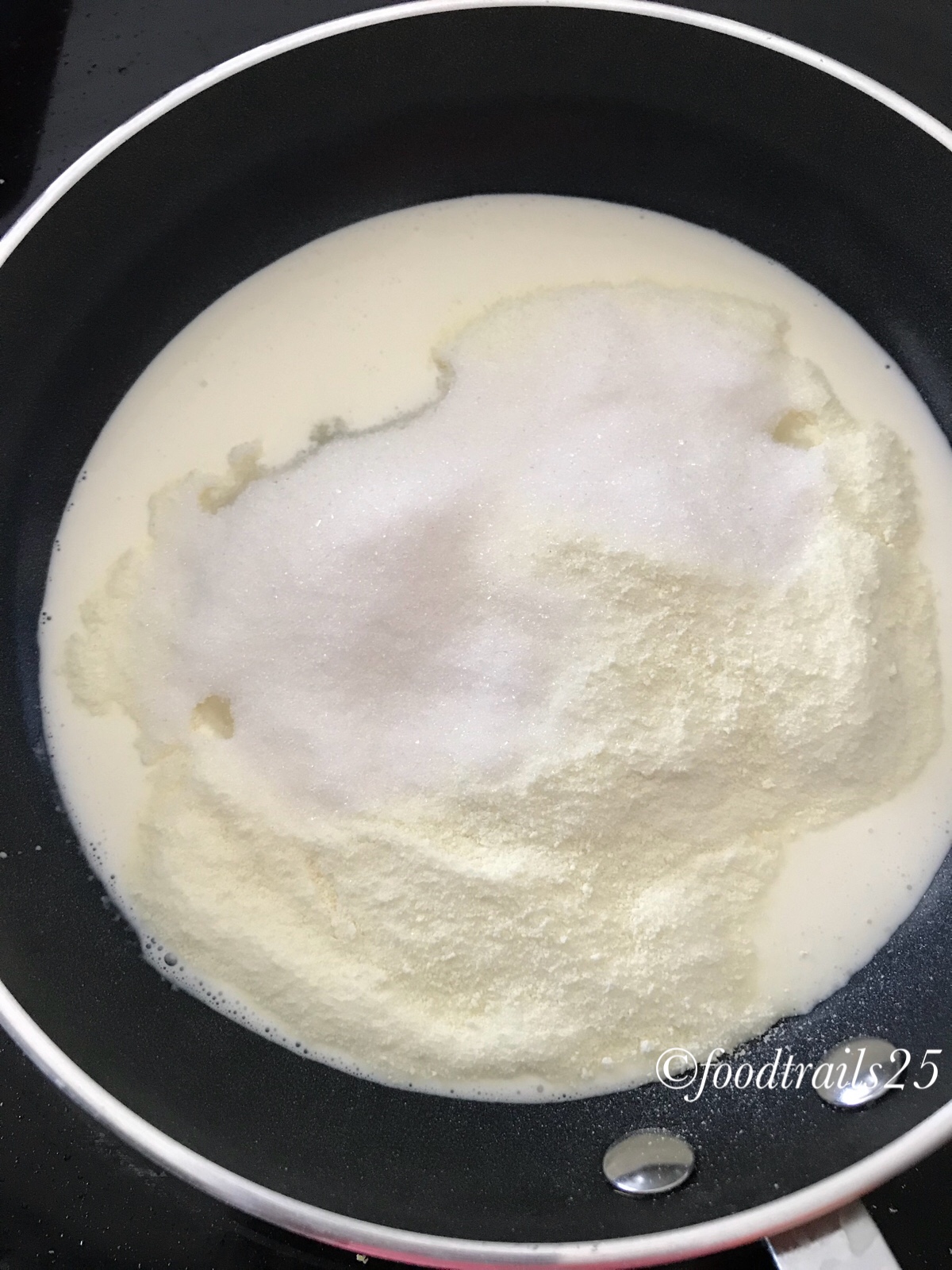 Assemble all the required ingredients. 1 cup fresh Paneer, 3/4 cup milk powder, 1/2 cup cream*,1/4 cup of sugar,1/2 tsp cardamom powder*. I keep my sweets and deserts moderately sweet.If you need more sugar you can add 1-2 more tbsp.