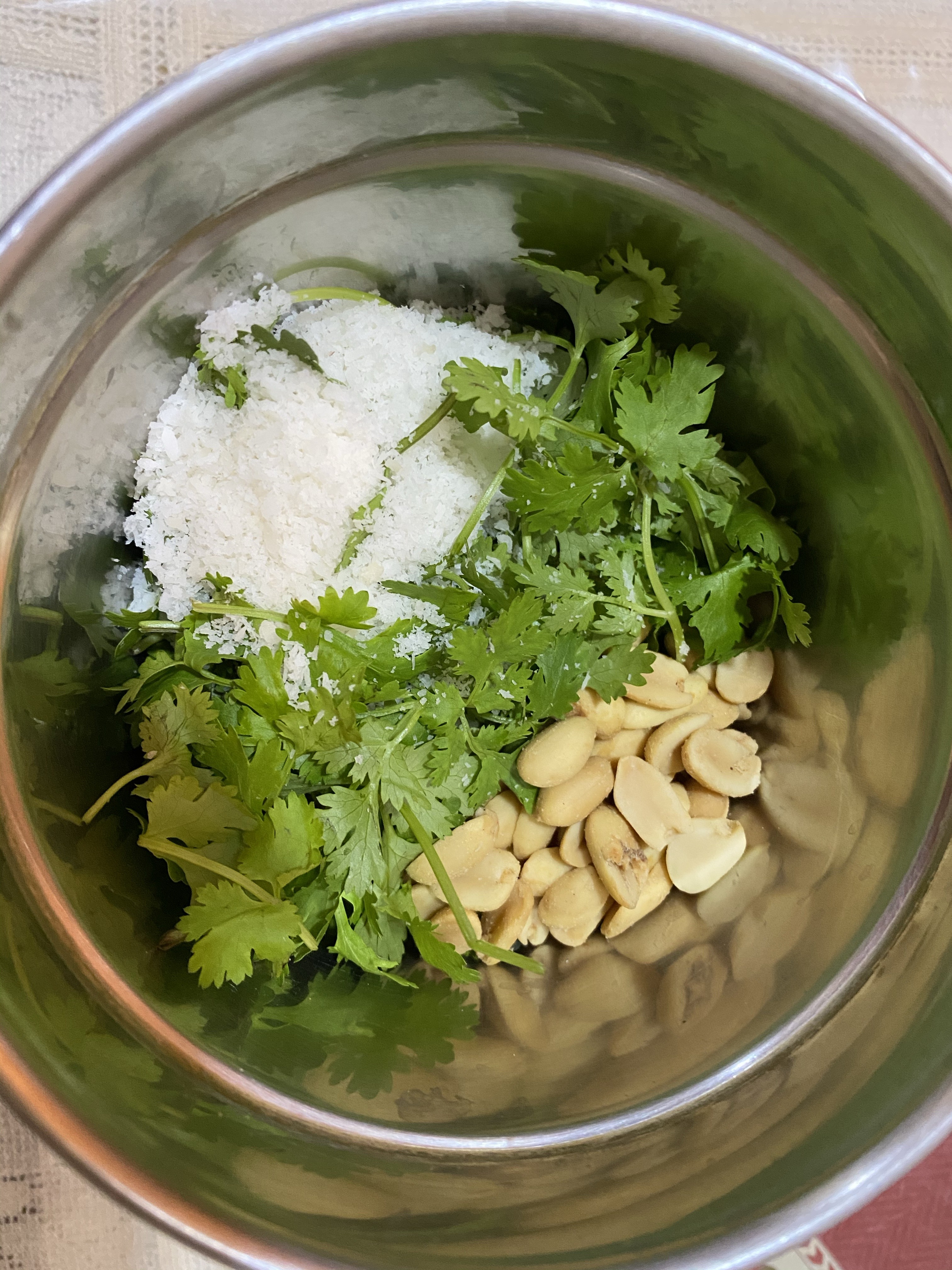 - Add all the ingredients(coconut, curry leaves, coriander leaves, peanuts, salt,green chillies) except yogurt in a grinder.