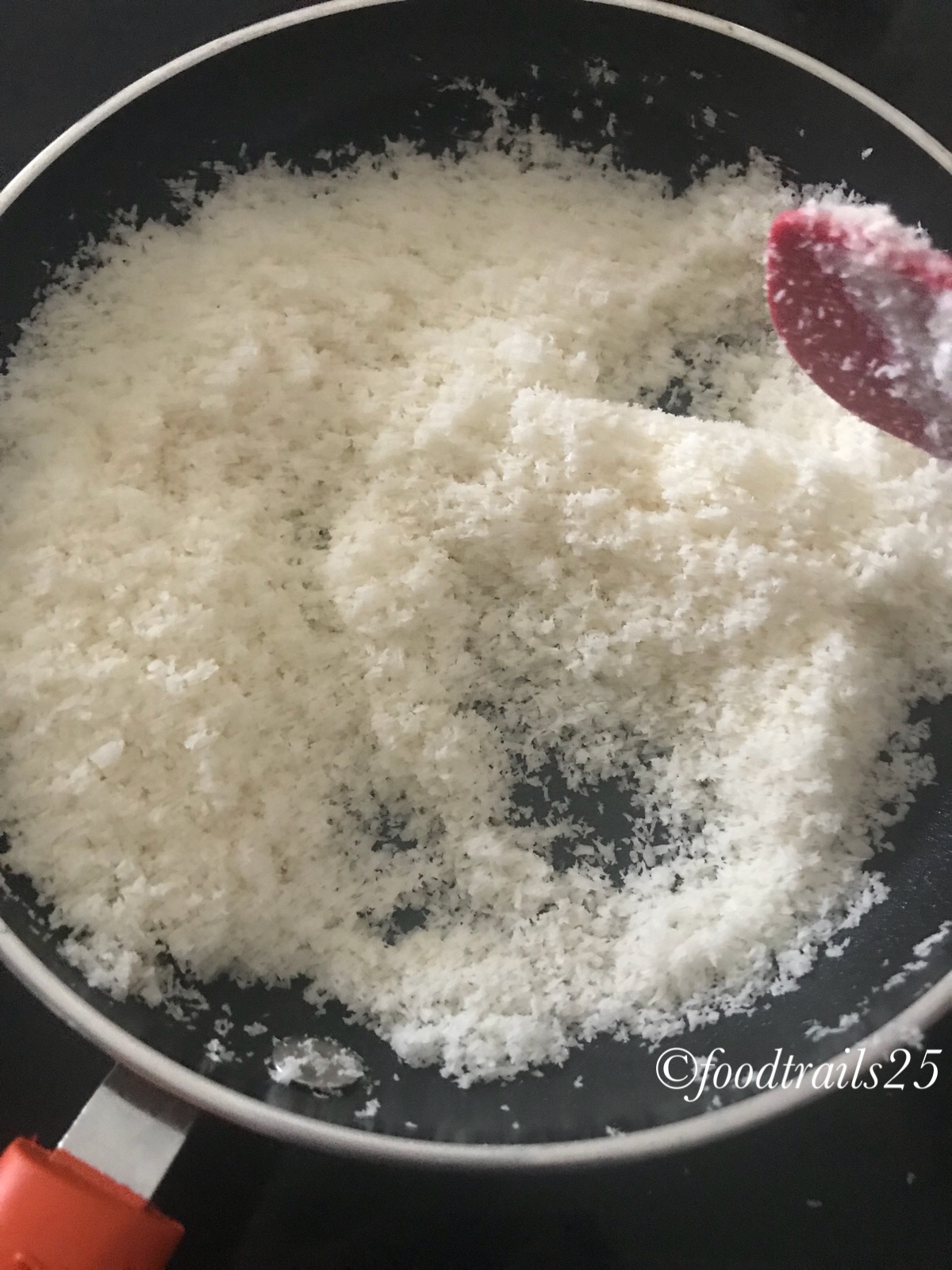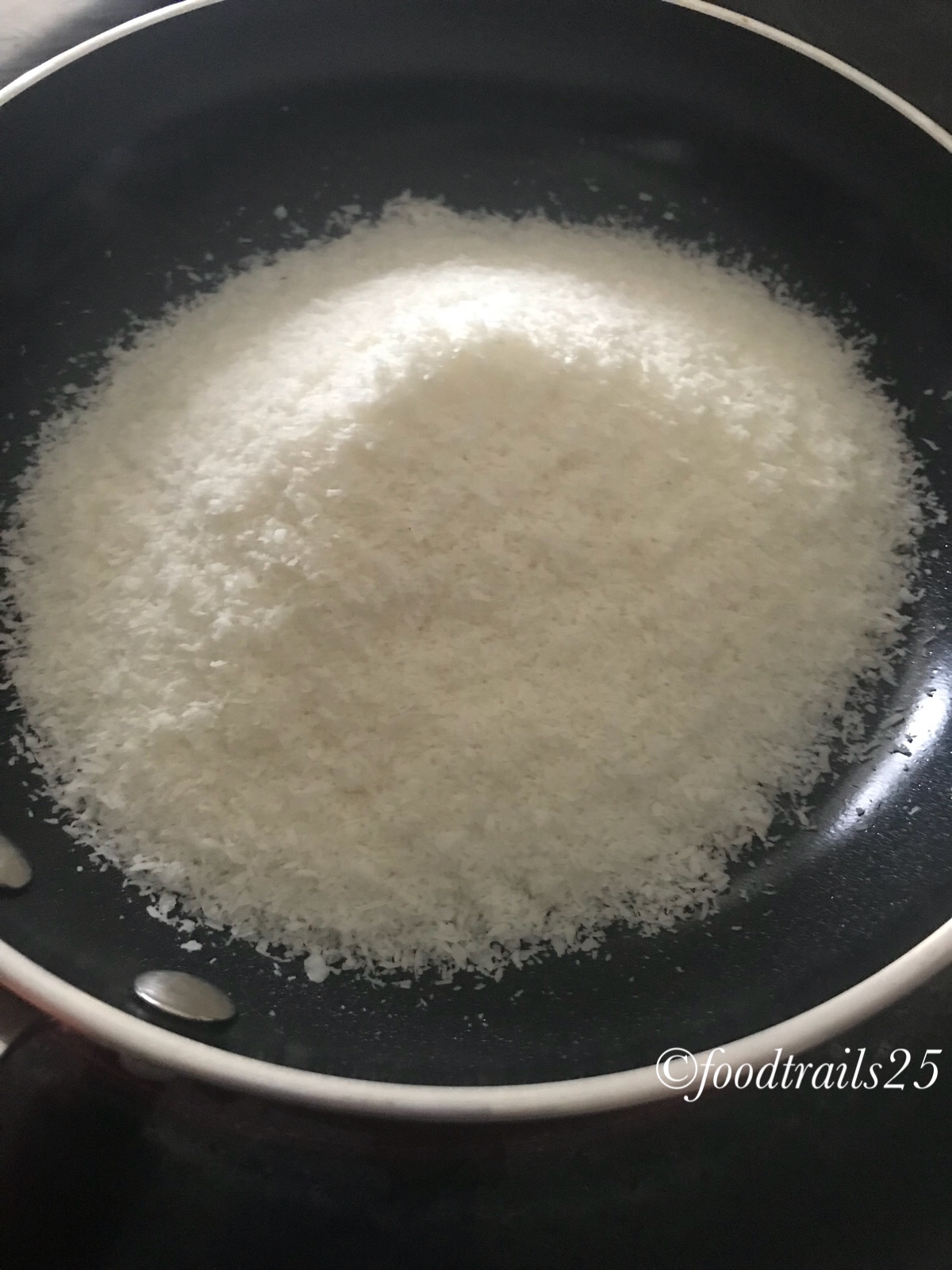 Roast coconut lightly in a non-stick or heavy bottomed pan, till very light brown, till it gives the aroma, with a tsp of ghee(clarified Indian Butter), you can roast without ghee also. Take care the coconut doesn't get too brown. Keep the flame to low.