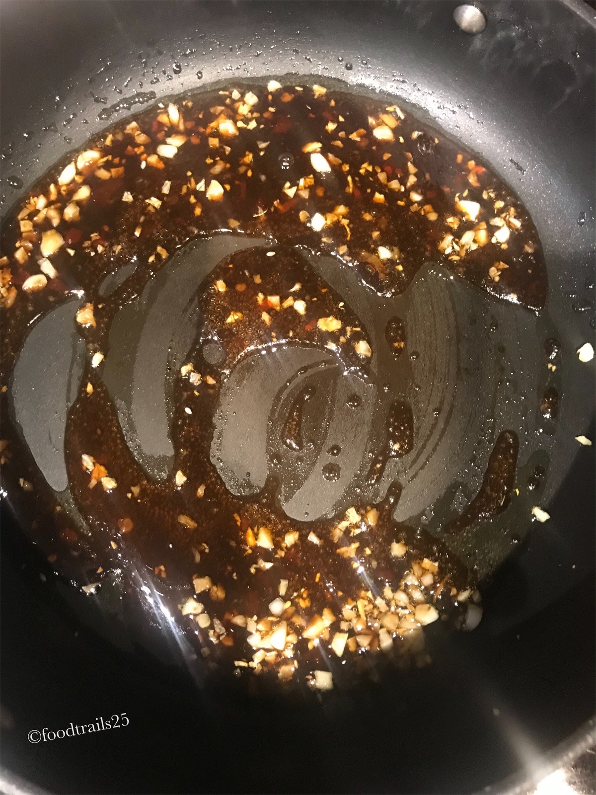 In a pan saute garlic for few seconds and add the sauces.