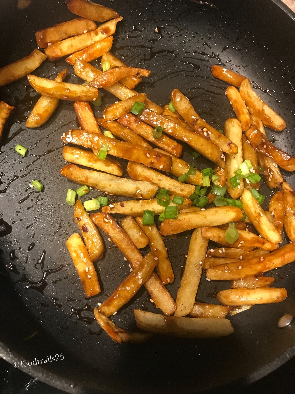 Store-bought frozen potato fingers are already fried once and packed, all we have to do is fry the frozen fries till crisp then coat in the sauce mix with sesame and chilli. Do not thaw the frozen fries before frying. Add to very hot oil, fry till golden brown and crisp, and then cook in sauce mix with sesame and chilli. Be very careful while frying as the hot oil sputters when we add frozen fingers to hot oil.