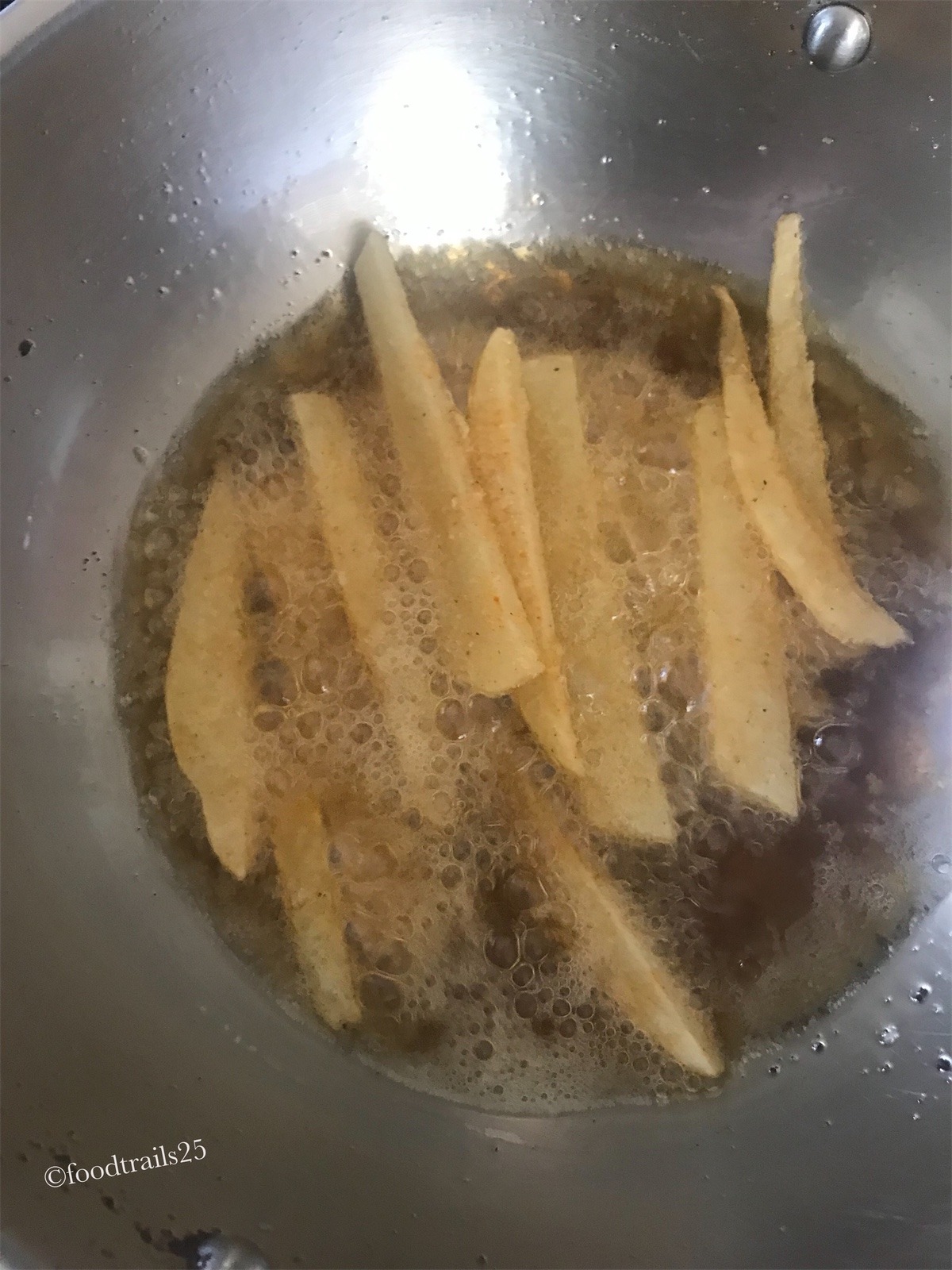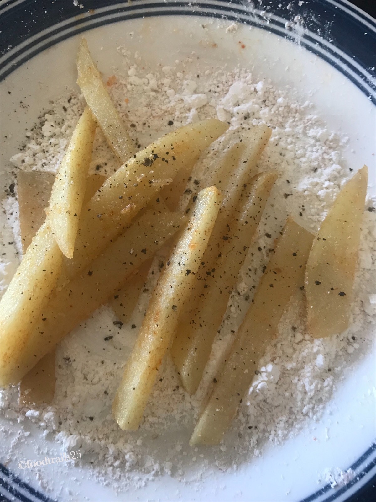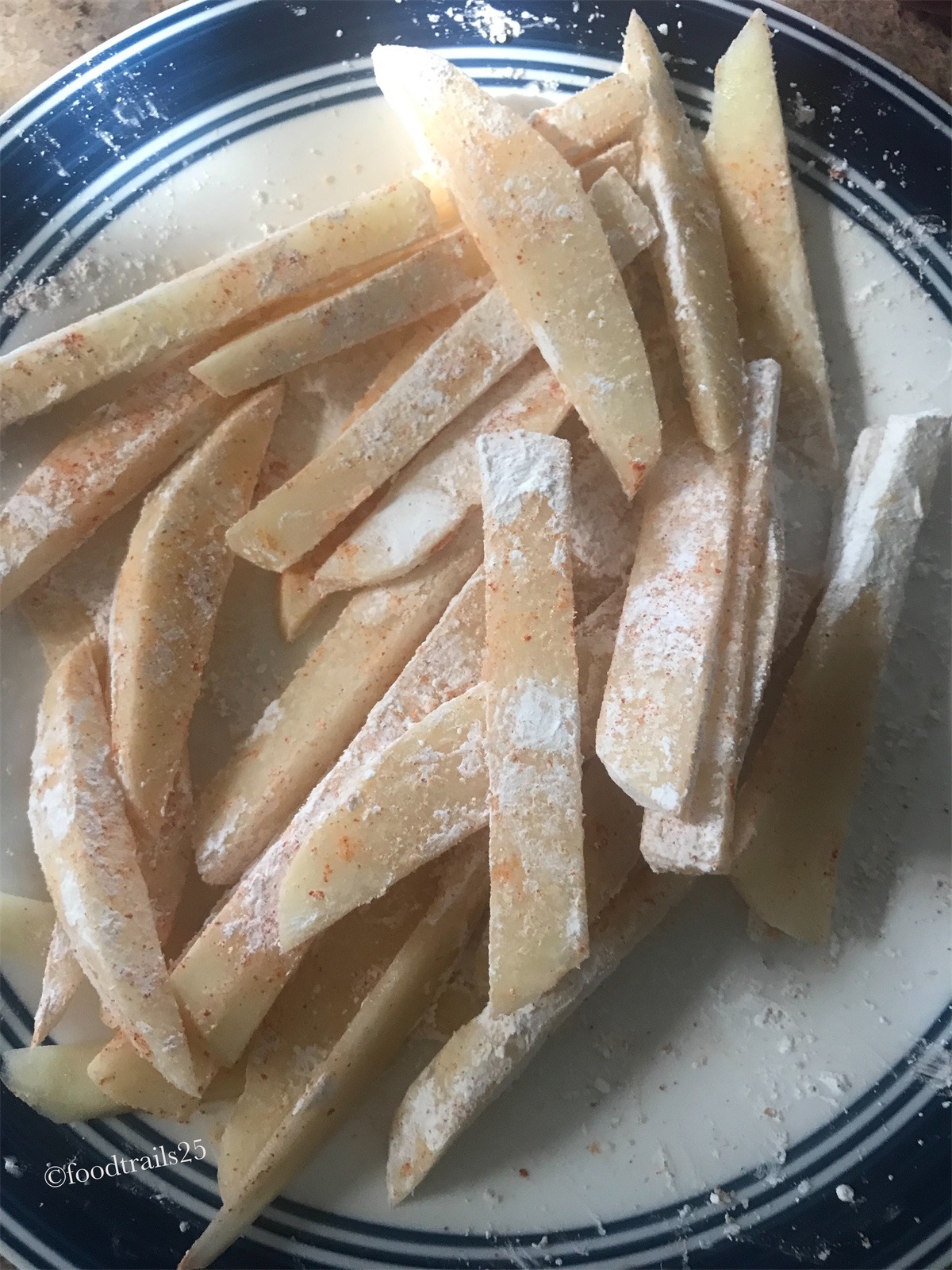 - fry the potato fingers twice coated in batter of cornflour.