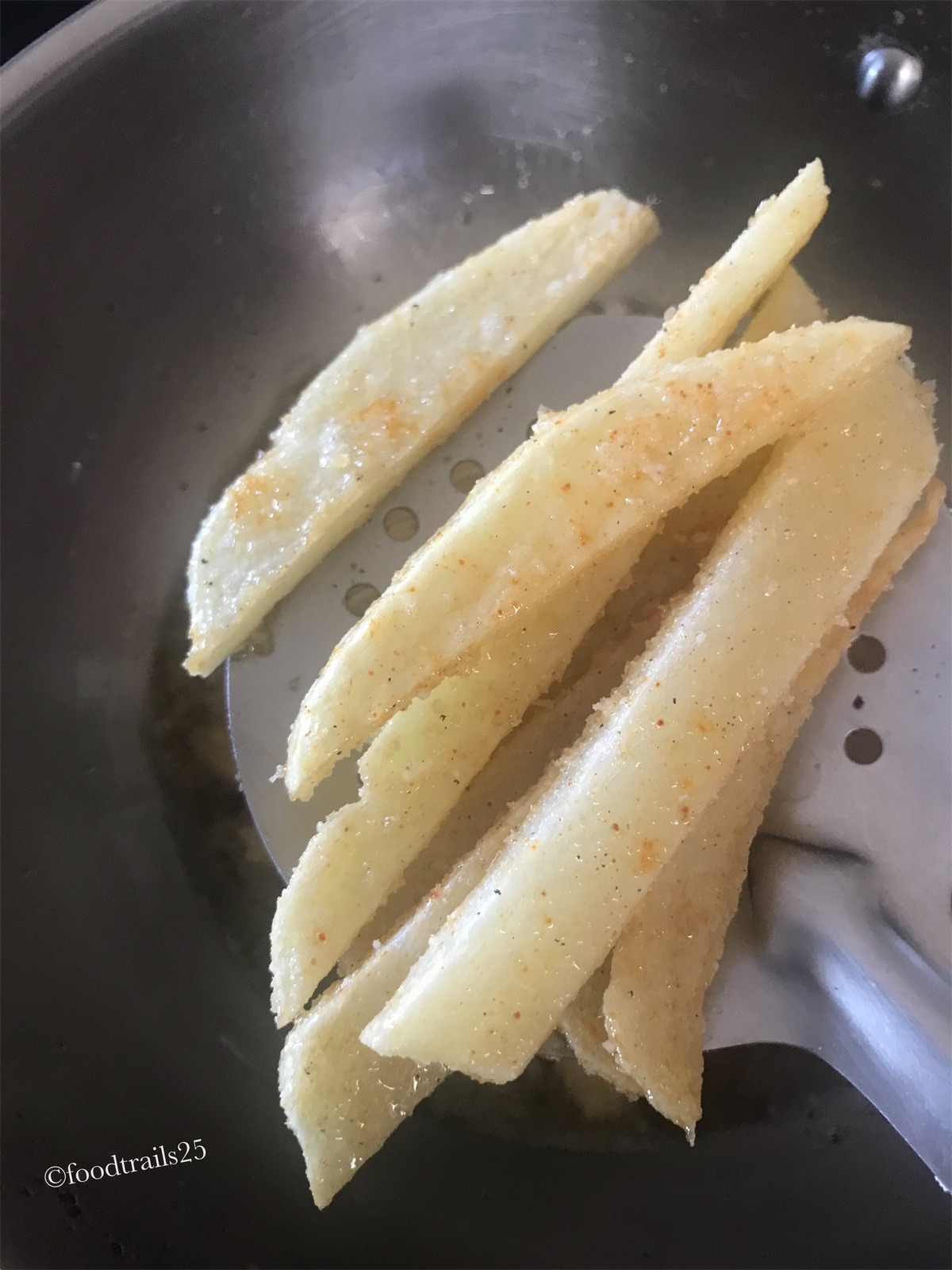 - Meanwhile heat oil in a heavy bottomed pan and fry until potatoes are just cooked. These should not start turning golden brown.