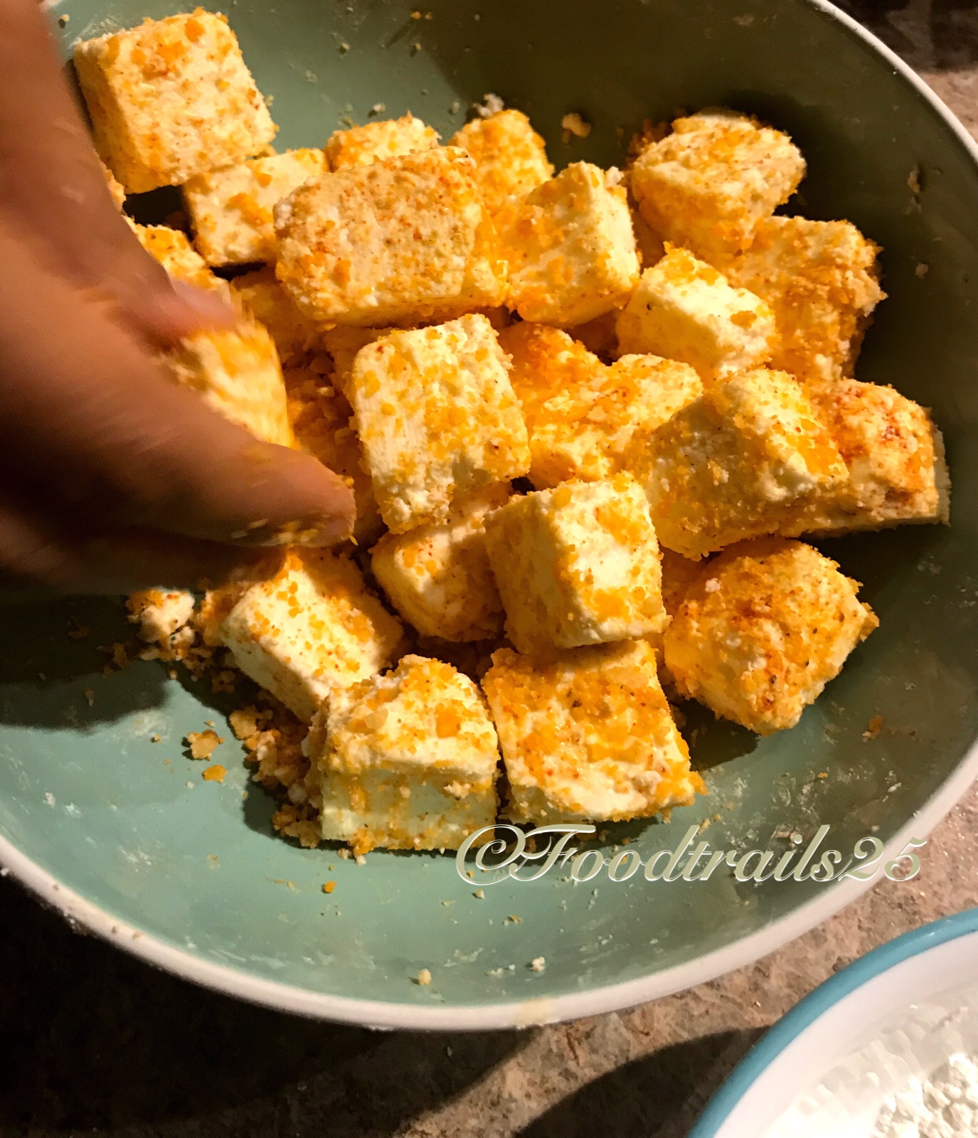 Add a 1-2 tablespoon Doritos mixture to Paneer cubes and press nicely on it, so that it coats the cubes evenly.