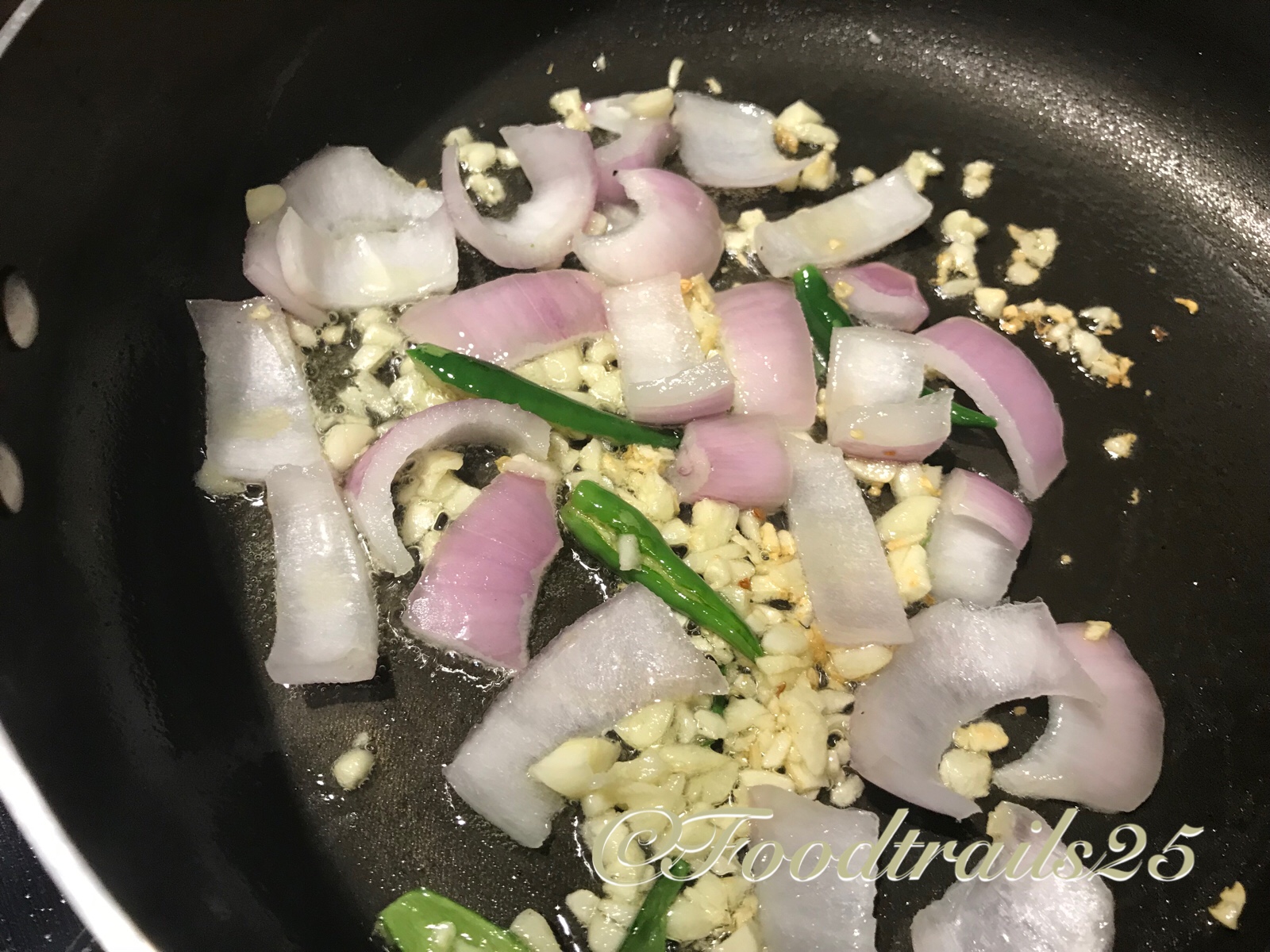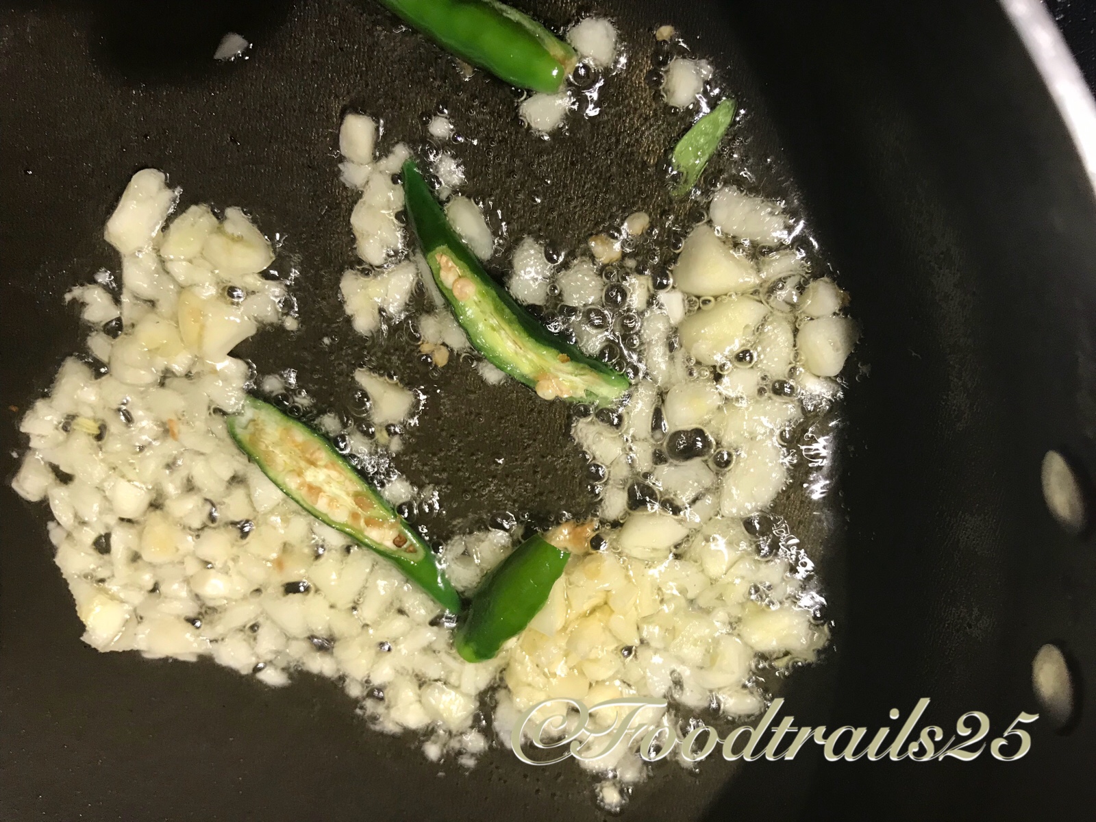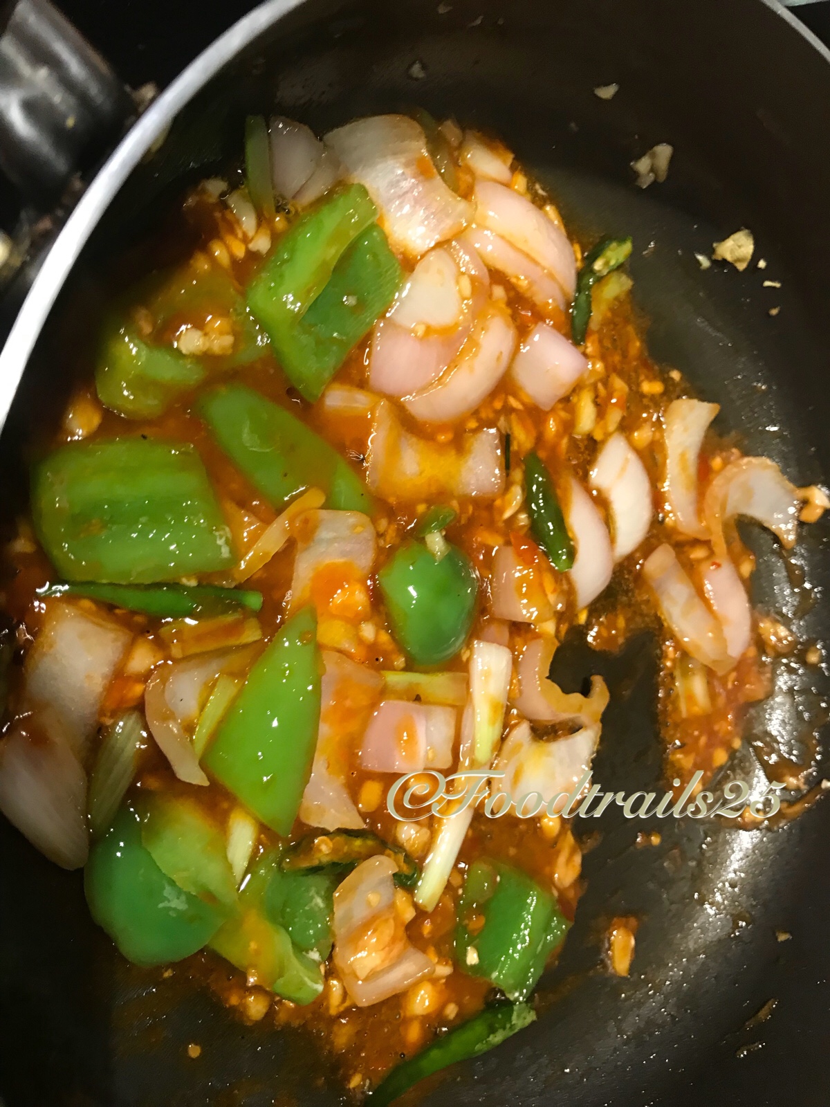 Heat oil in a pan, and add garlic, saute for a minute, add onions, bell peppers, and green chillies.