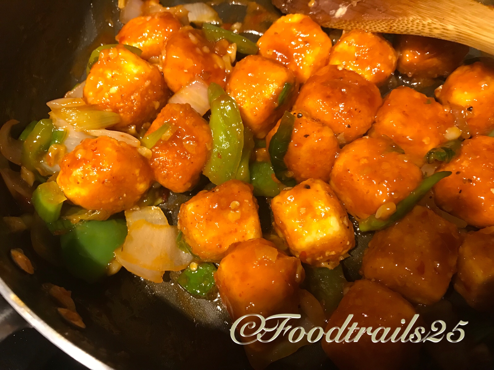Another version of Chilli Paneer one of the favorites in Indo-Chinese Cusine. This is made with any kind of nuggets available. I had some homemade paneer nuggets in the freezer, so used these. Fry the nuggets, saute in Asian Sauces( Soya sauce, Chilli Sauce, and Tomato Sauce). You can use chicken nuggets and make a Chilli Chicken kind of version. Any kind of store-bought nuggets work fine with the recipe.