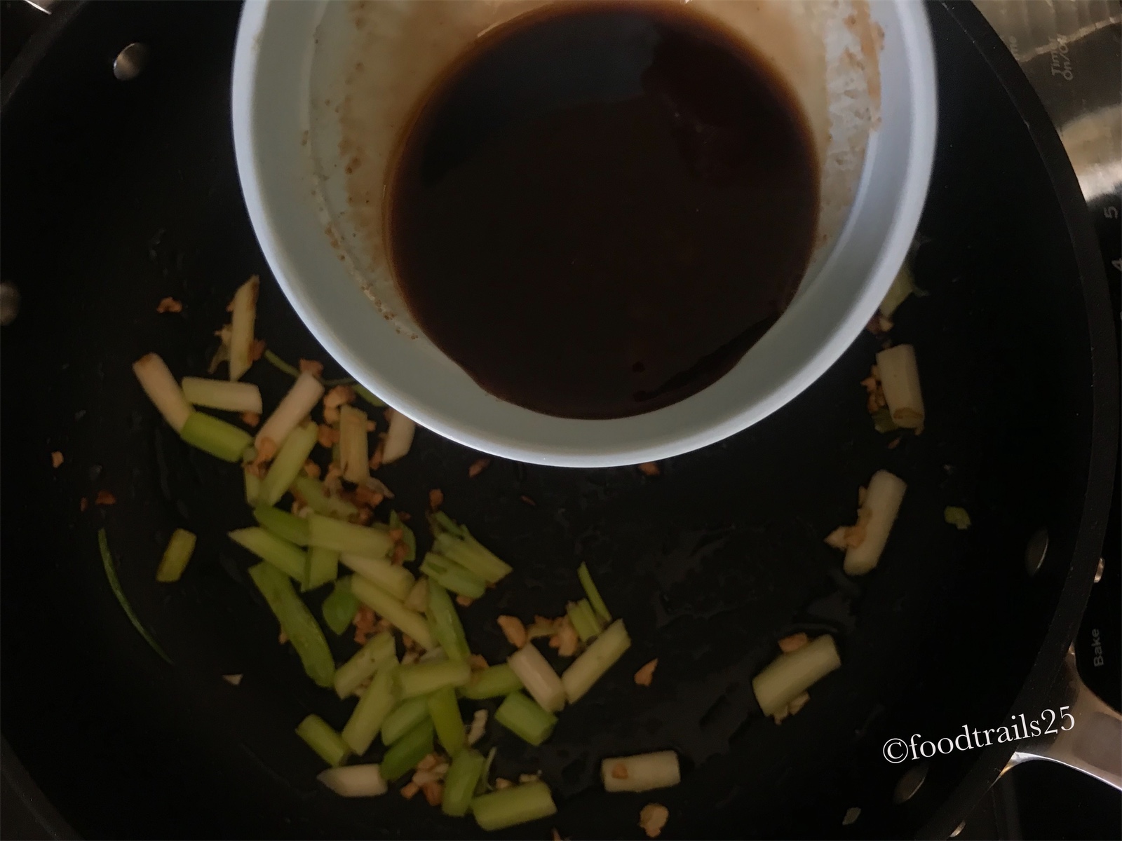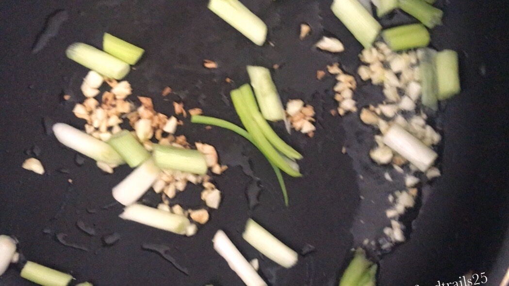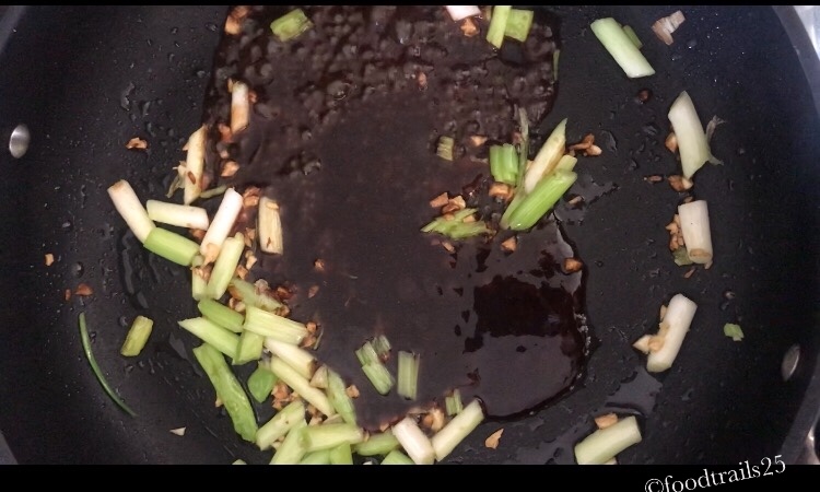 - In a wok or pan,add oil once it is hot add garlic and saute till the raw smell goes away.2 tbsp Seasame oil