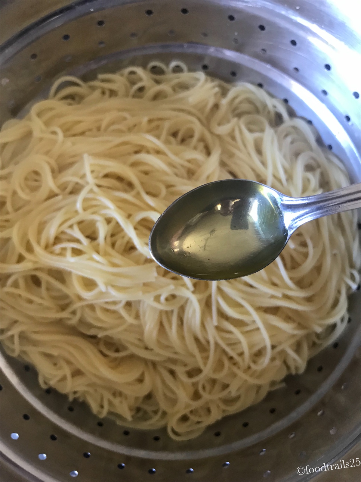 - Once done, add drain noodles and add 1tsp of oil, mix lightly and nicely (can use hands) and spread on a flat plate/dish.1 tsp Oil(Sesame preferred)