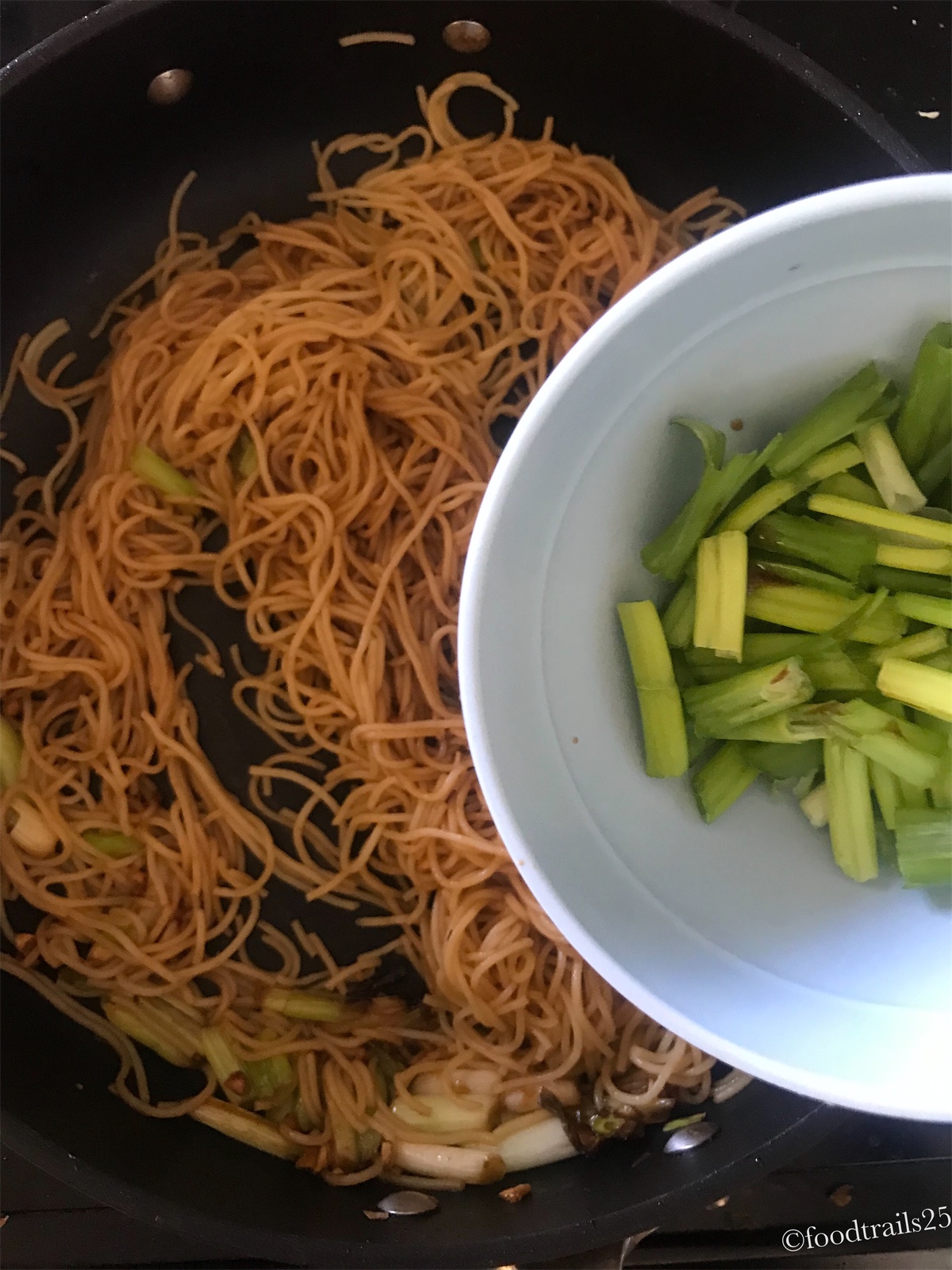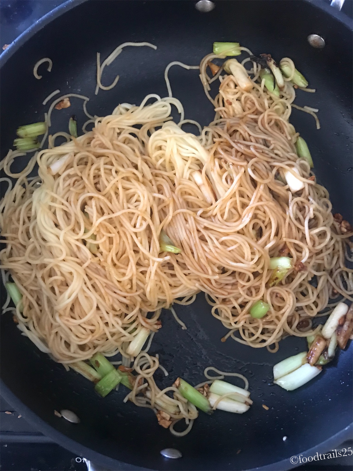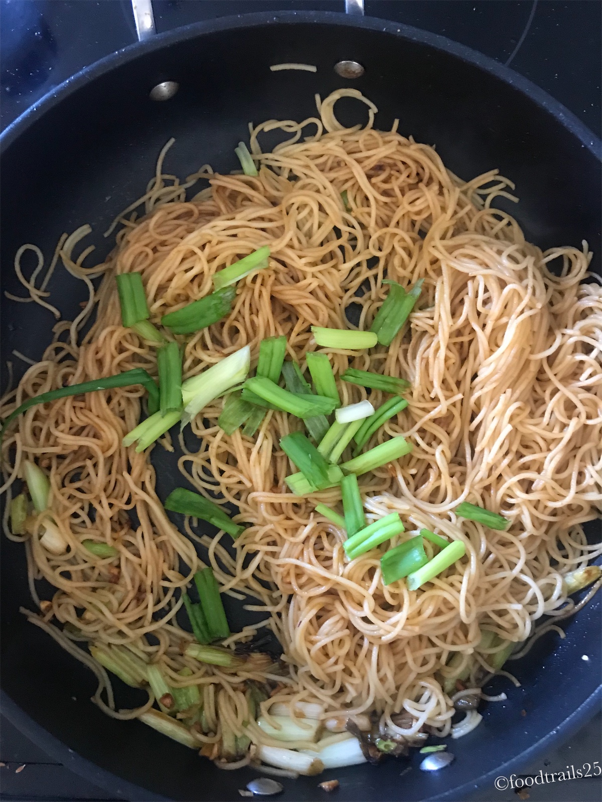 Use lots of garlic. I loved this simpler version as I could taste the tiny garlic bites which would have been lost if I added more vegetables just like the Chowmein . Spring onions add the much need crunch, use both parts.. the white and the green part.