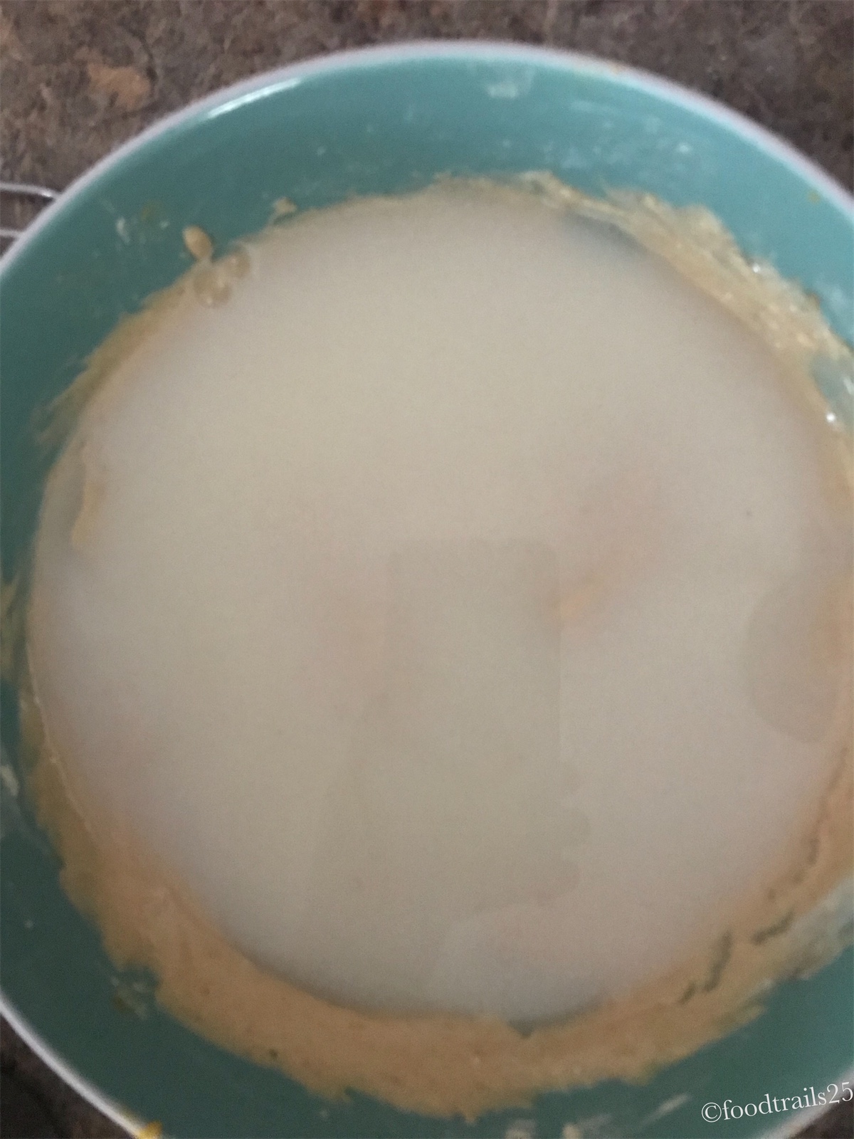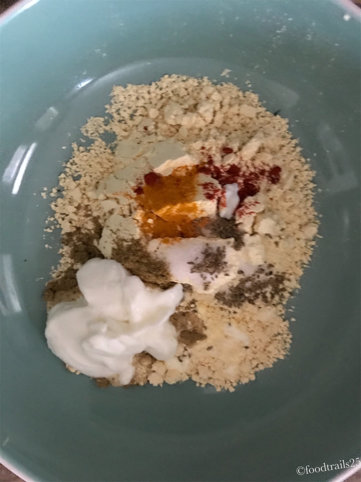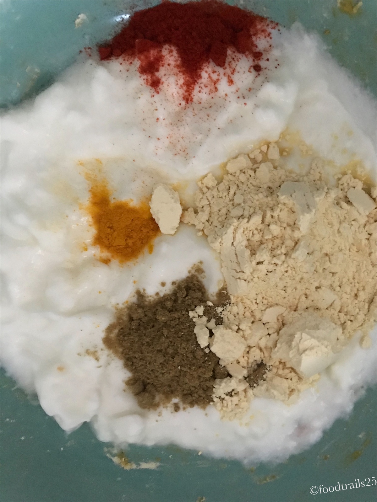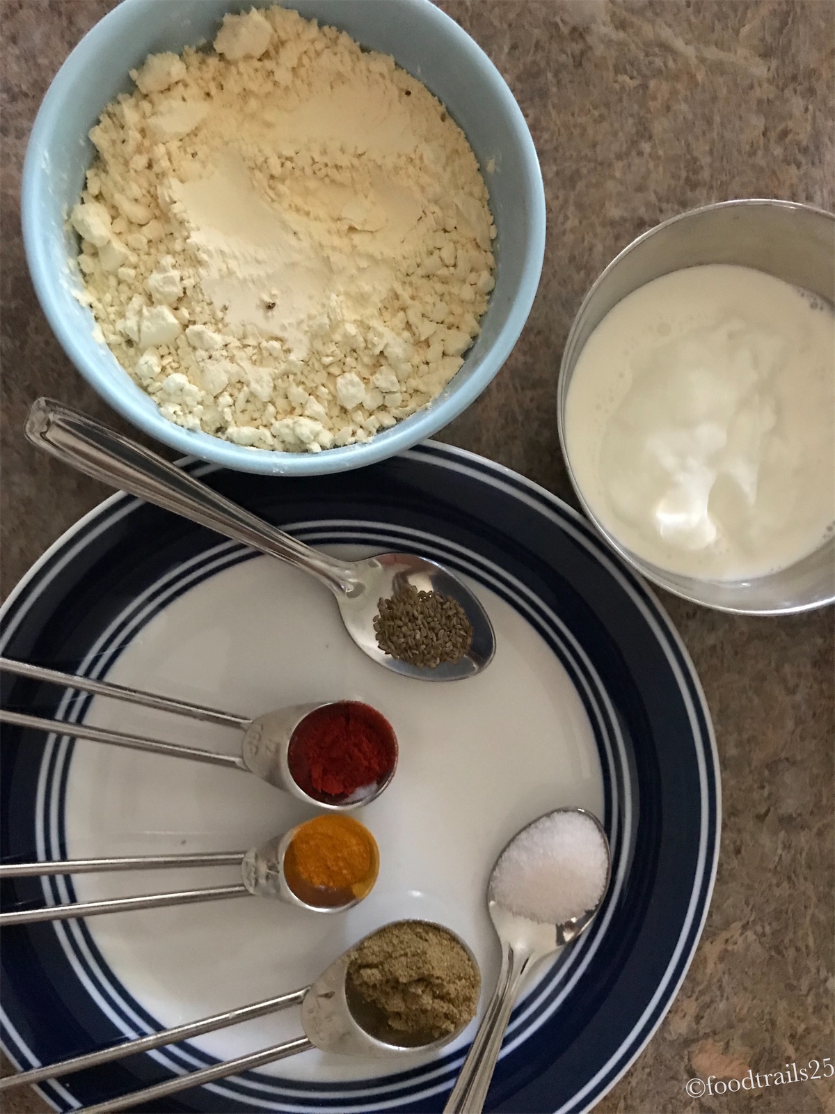 - Mix together yogurt, besan, add around 1 cup water, slowly mixing the flour. Take care no lumps are formed. If you get lumps, seice the mixture.