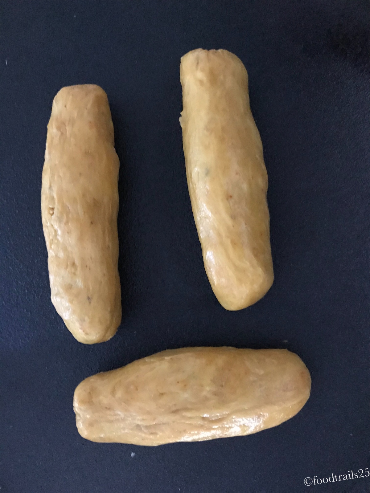 - Lightly oil the palms and roll out the dough in the form of cylinders as shown in the pic below.