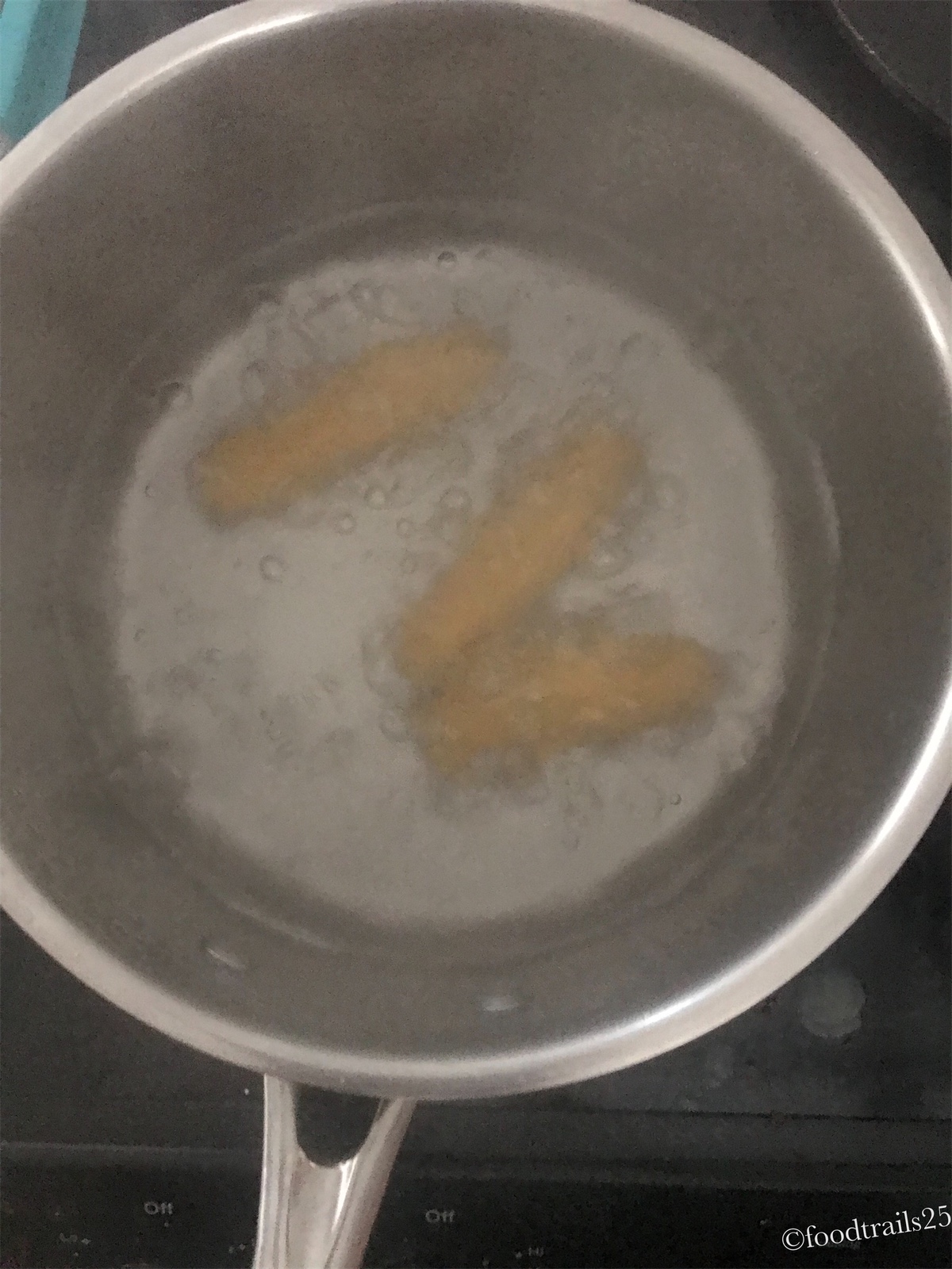 - Boil for 10-15 minutes in it. Let it cool and cut into 1/2" pieces.