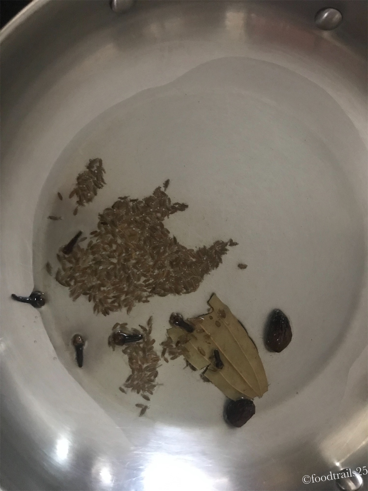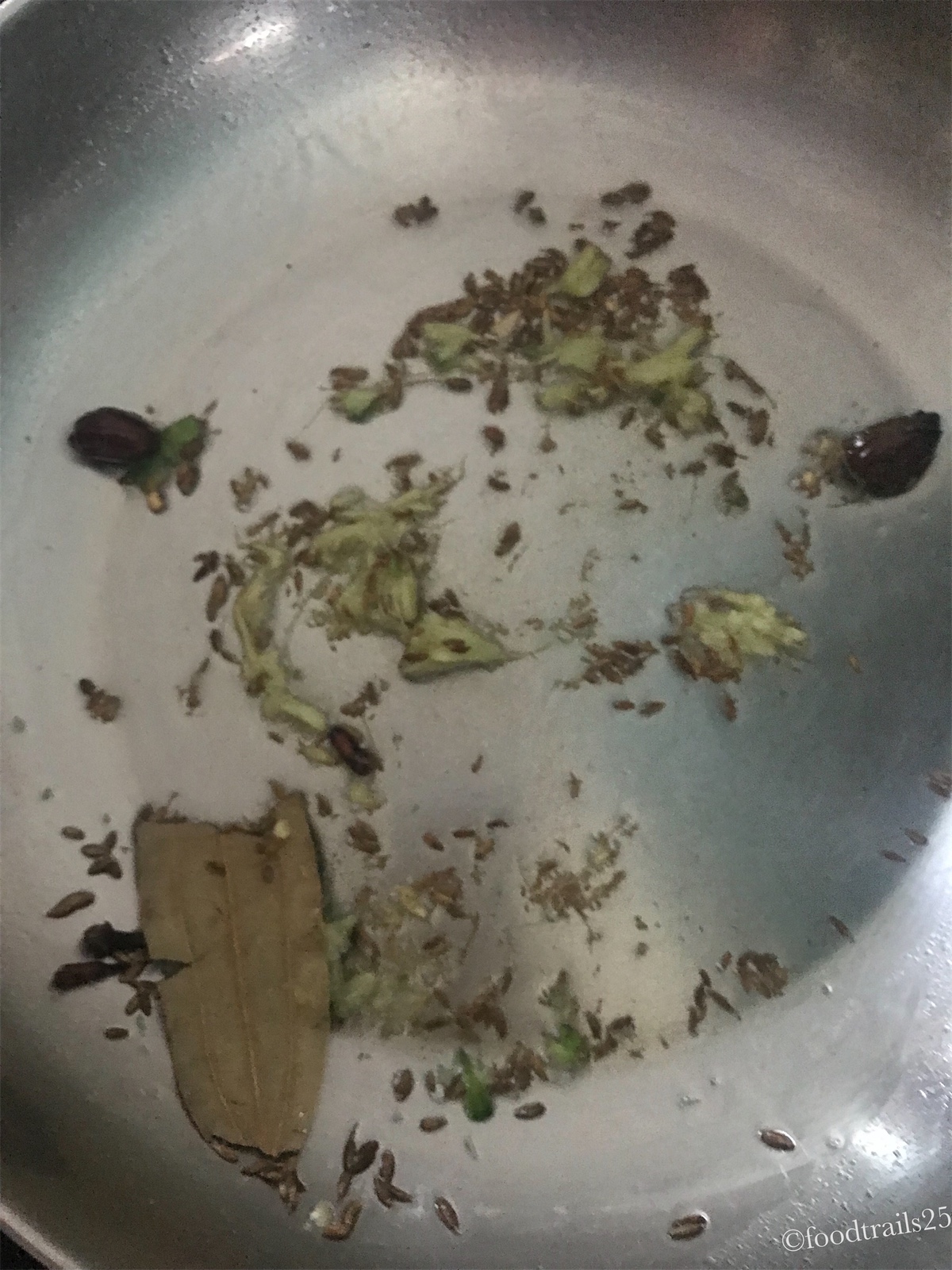 - Heat oil in a pan/kadhai. Add cumin seeds. When the seeds crackle, add the whole spices and fry for few seconds.
