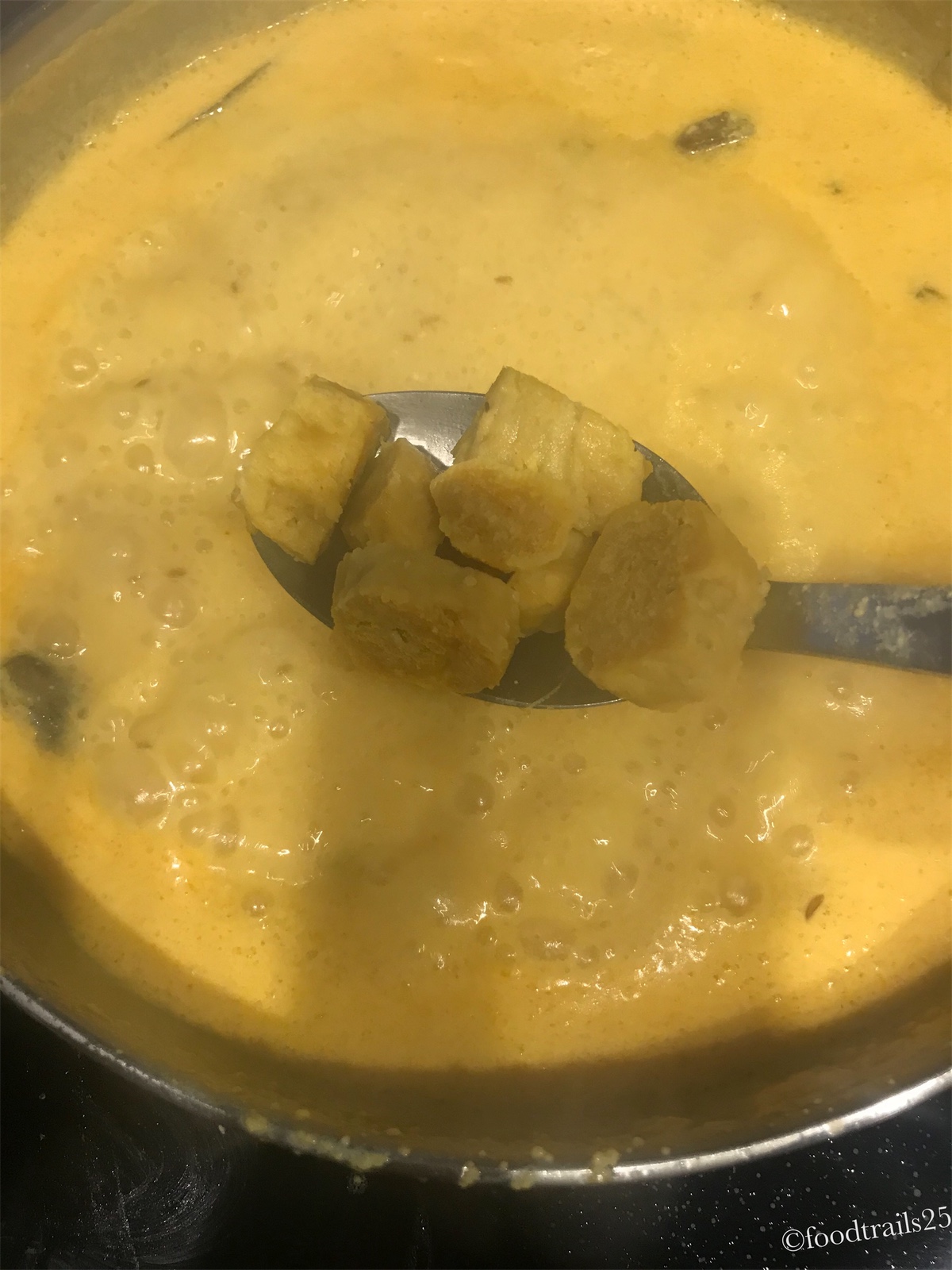 - In a pan take oil, when the oil is hot enough, fry gatte till light brown, take out and keep aside. this step is optional and you can add gatte direclty to curry.