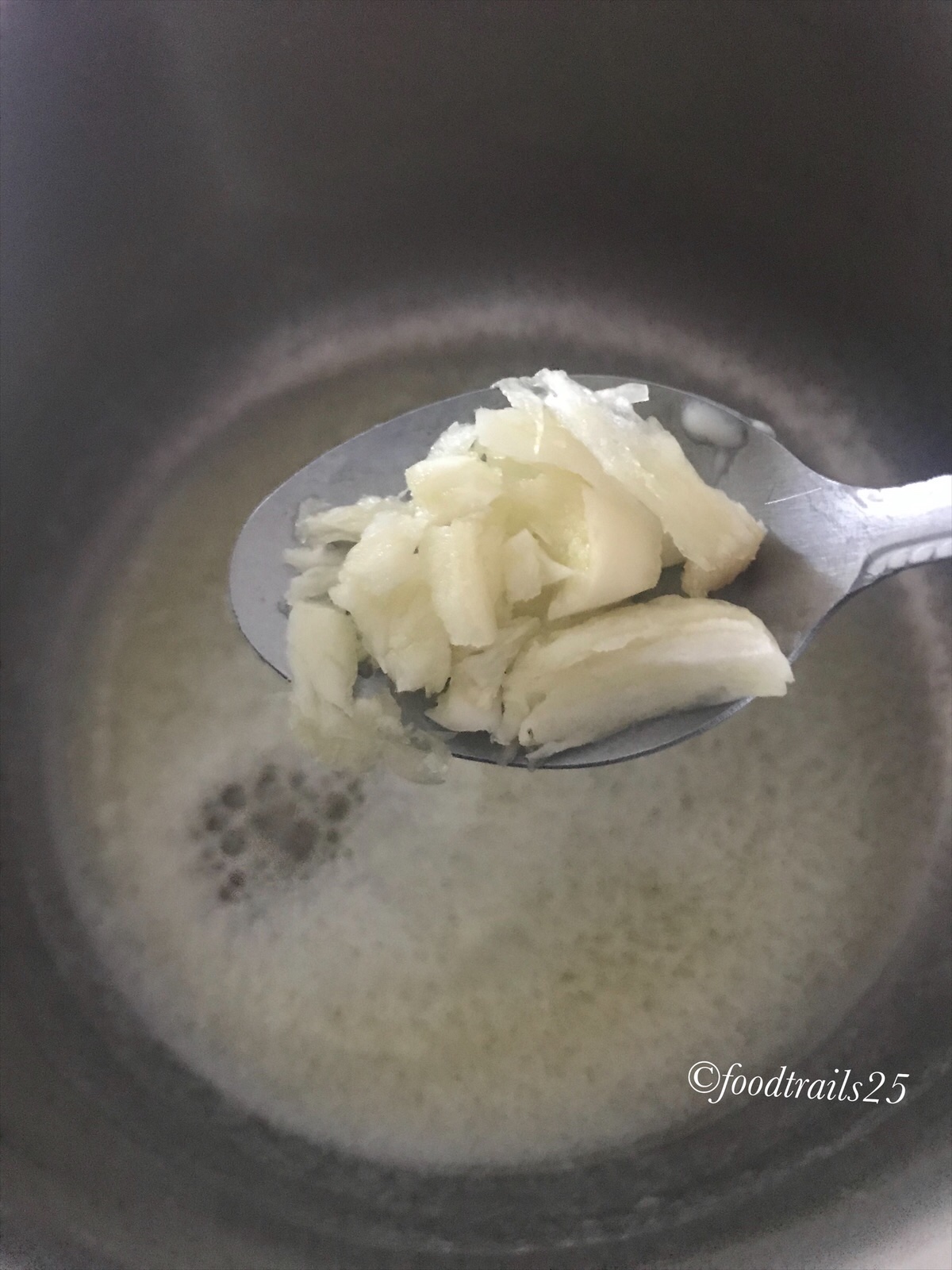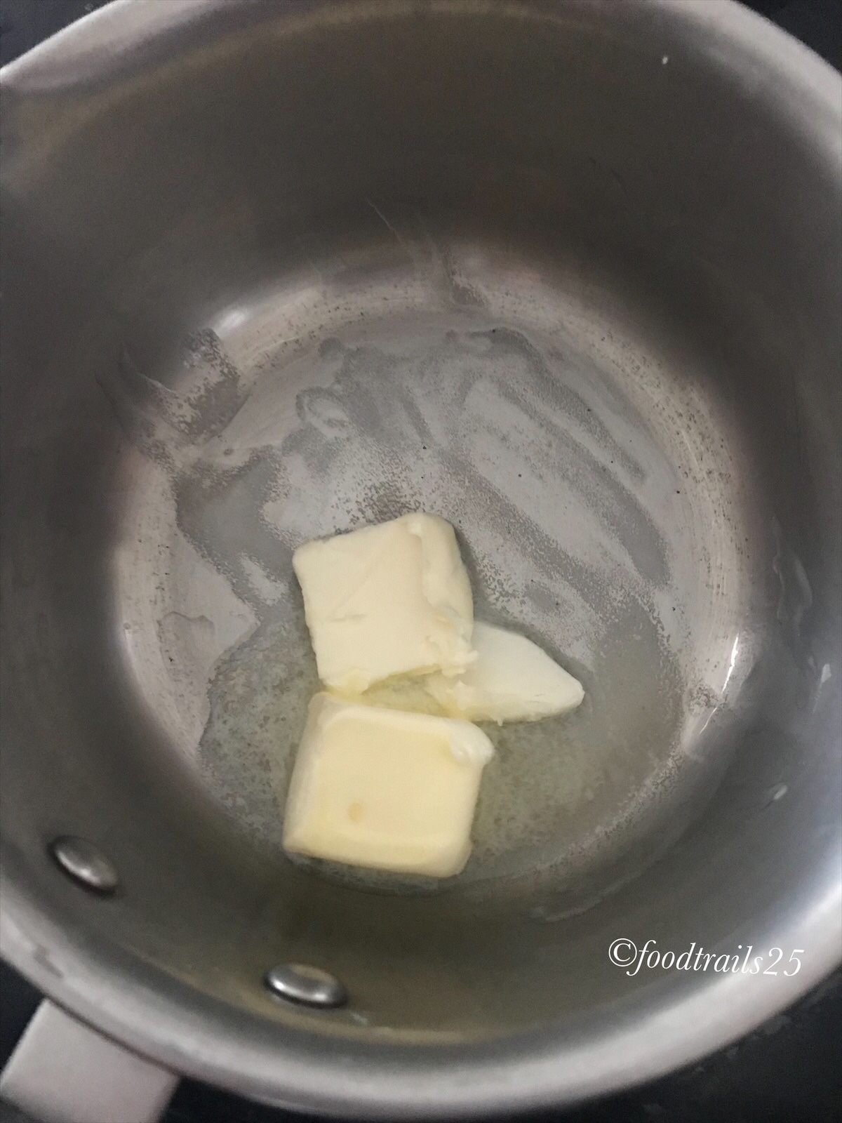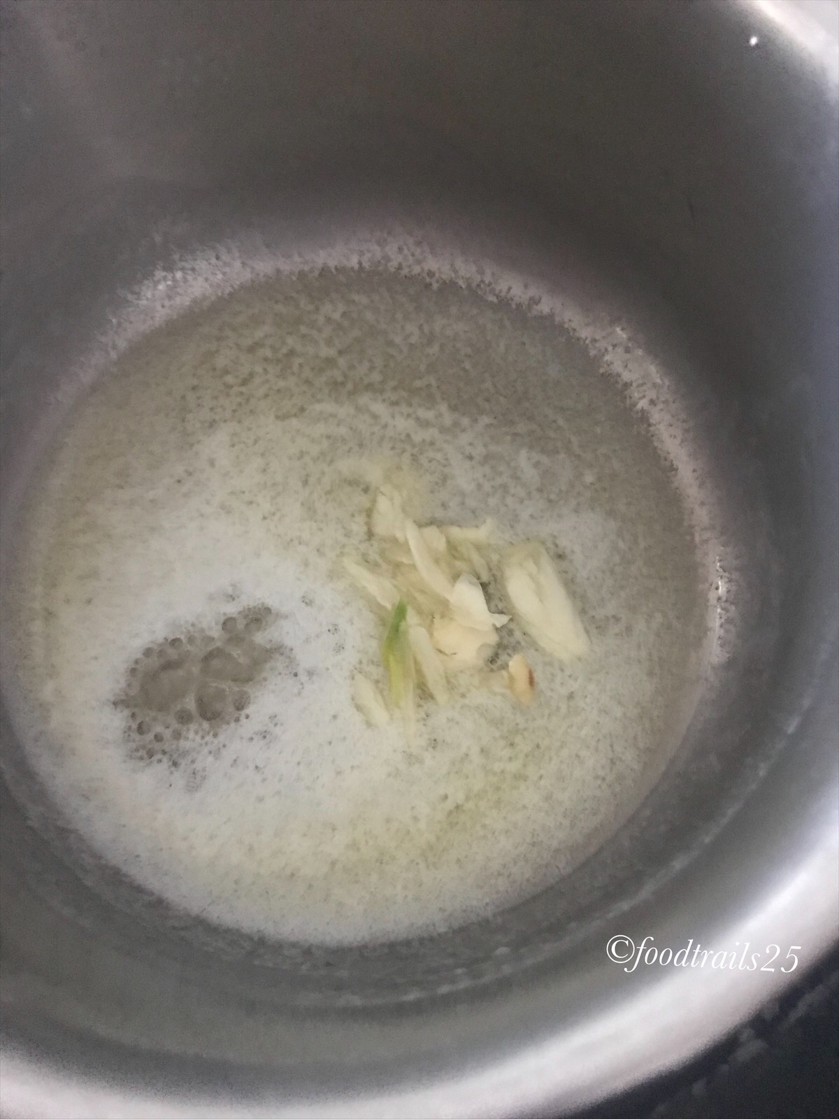 - In a pan melt butter, crush garlic clove and saute in butter till light brown. You can take out the garlic from butter while making roux or leave it.