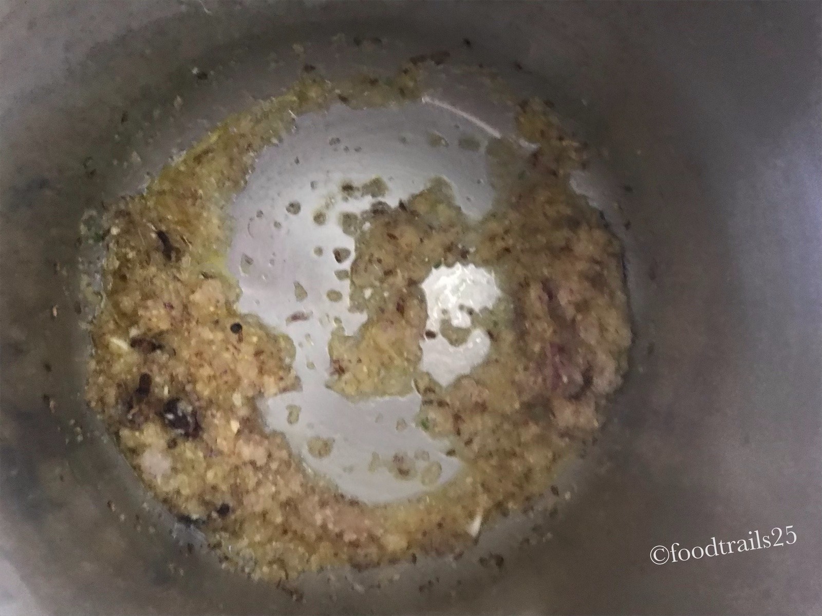 - When the seeds crackle, add onion paste and cook it till it turns light brown. Keep scraping the masala that sticks to bottom, as it can burn the masala.