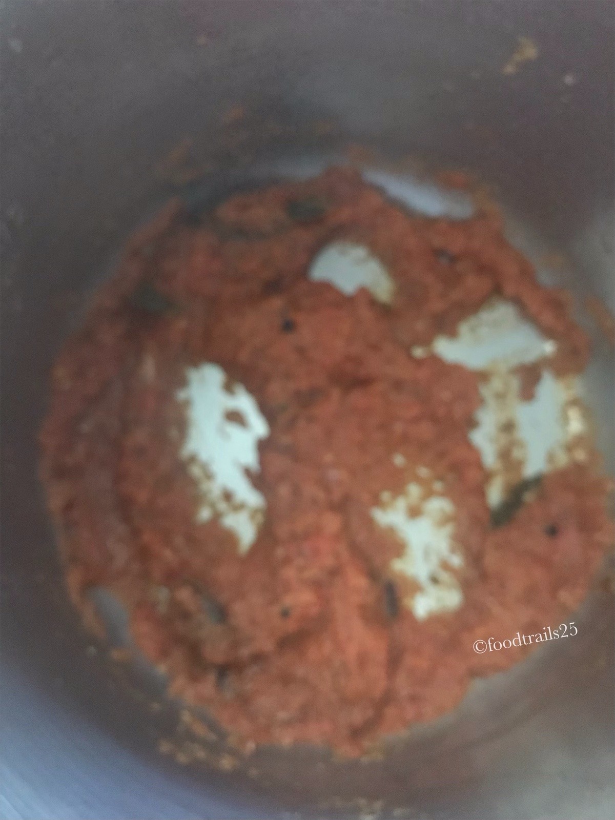 - Add tomato puree and cook till the masala gets a paste like consistency.