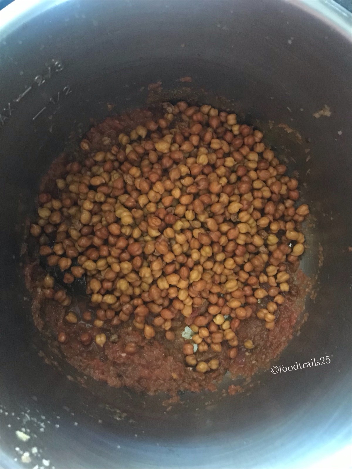 Add Bhuna Masala to inner pot, switch Instant pot to SAUTE mode, cook masala, add required spices and add kala chana/black chickpeas. Add water as required.