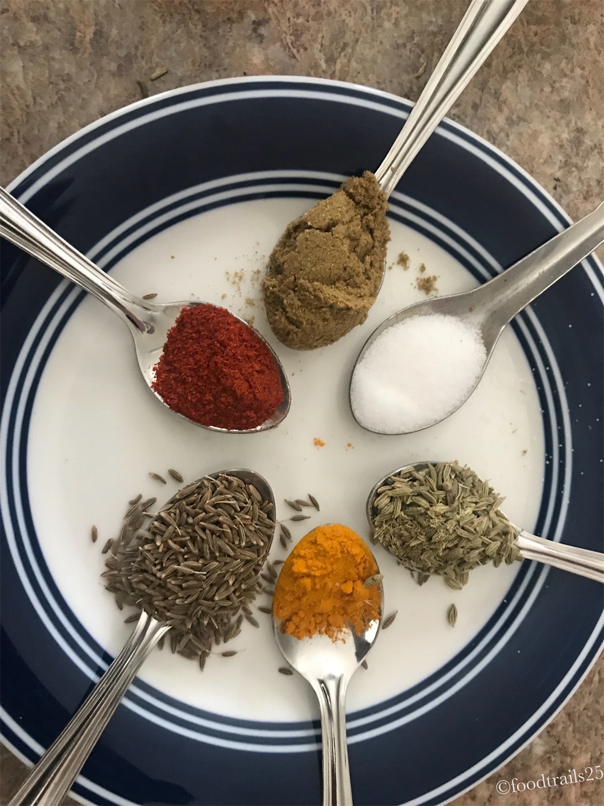 Karela/Bottle Gourd, thinly sliced onions, green chillies(optional) and dry spices like dry mango powder, coriander powder, fennel seeds, cumin seeds, turmeric powder, red chilli powder and salt. These spices balance the bitter flavor of the karela. That's the beauty of Indian Cuisine where on one side the spices enhance the taste, add on to the health benefits and delicately balance the taste of the overpowering ingredient.
