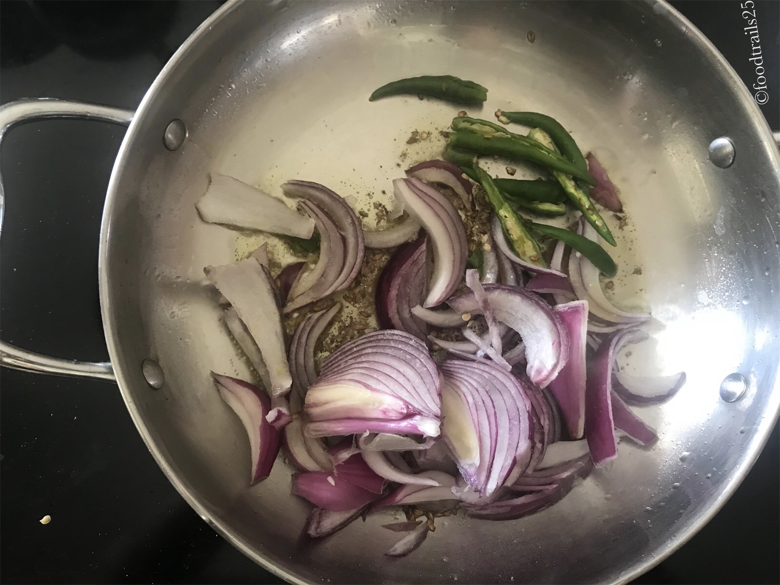 - When the seeds crackle, add sliced onions and saute for a minute.