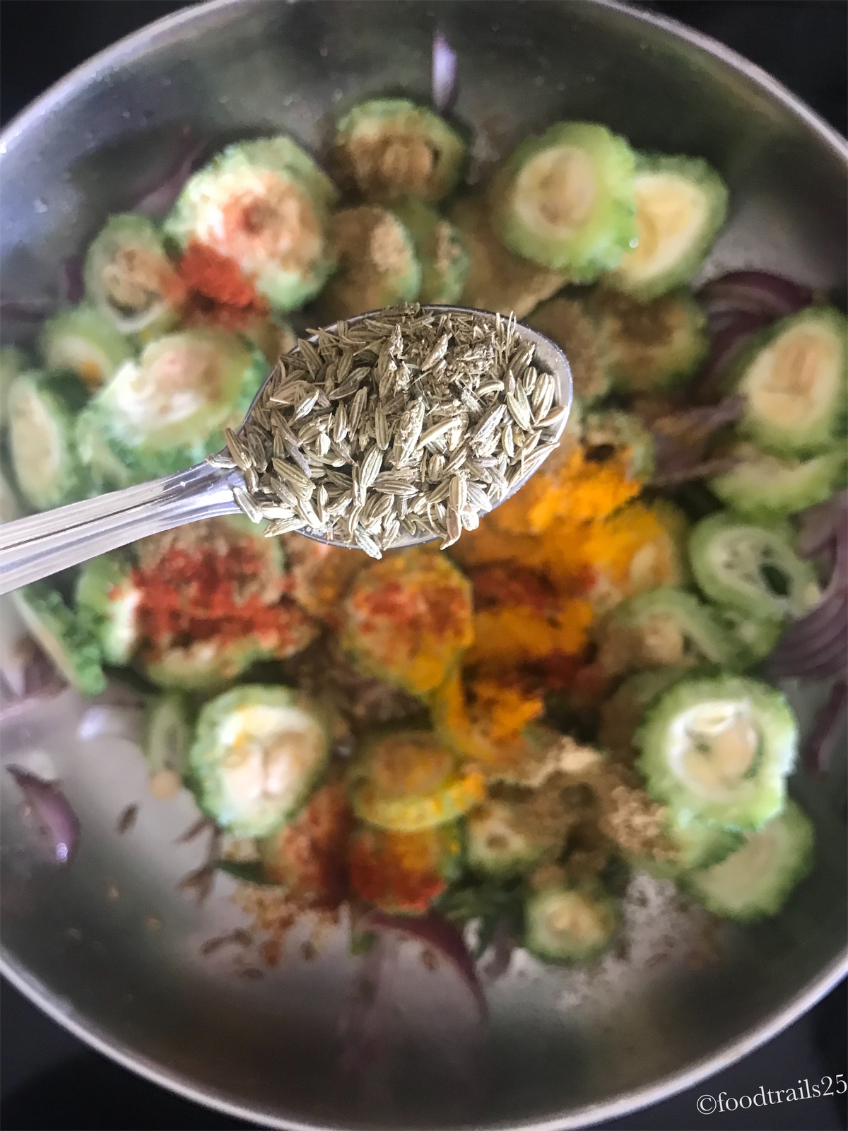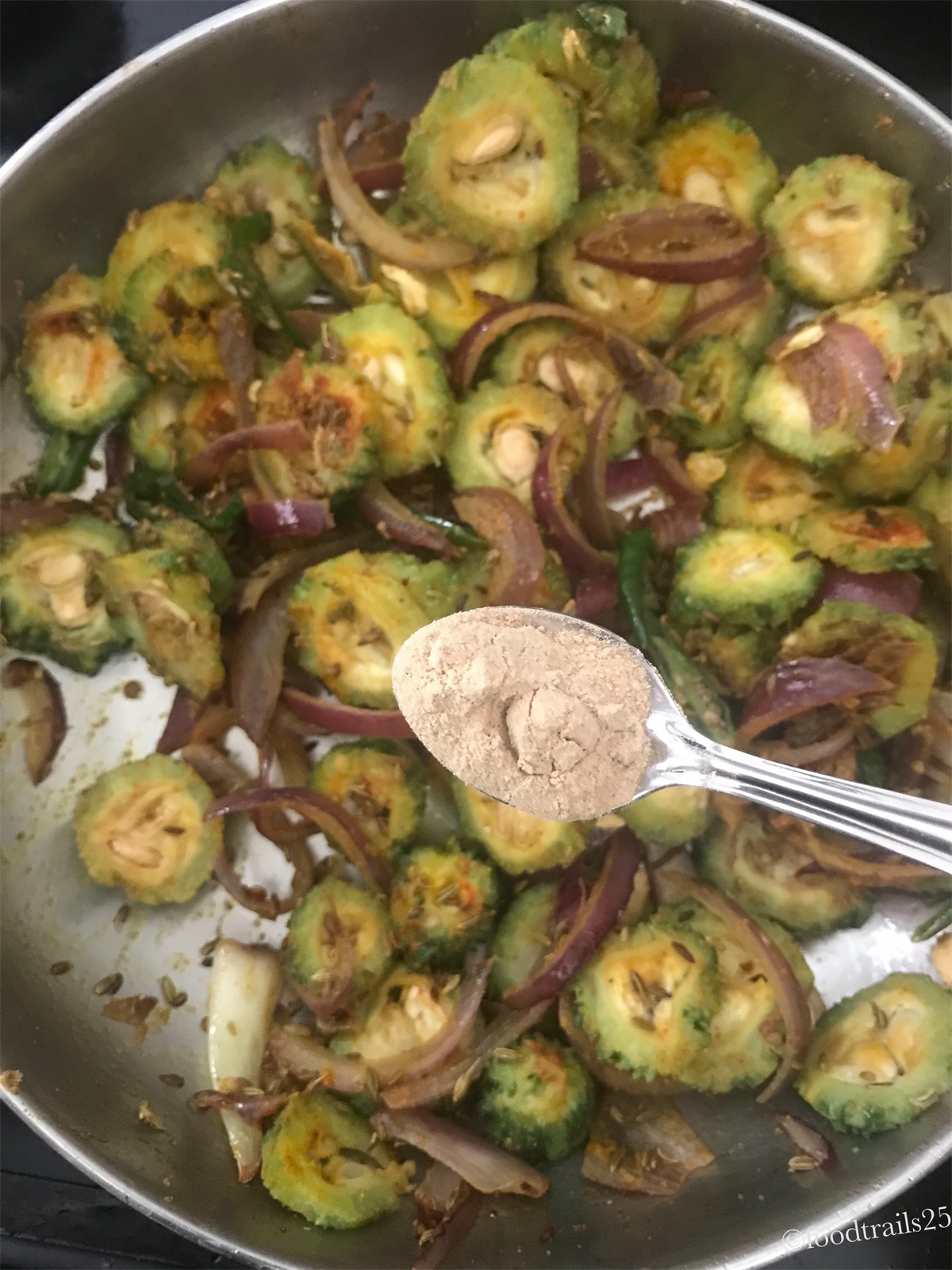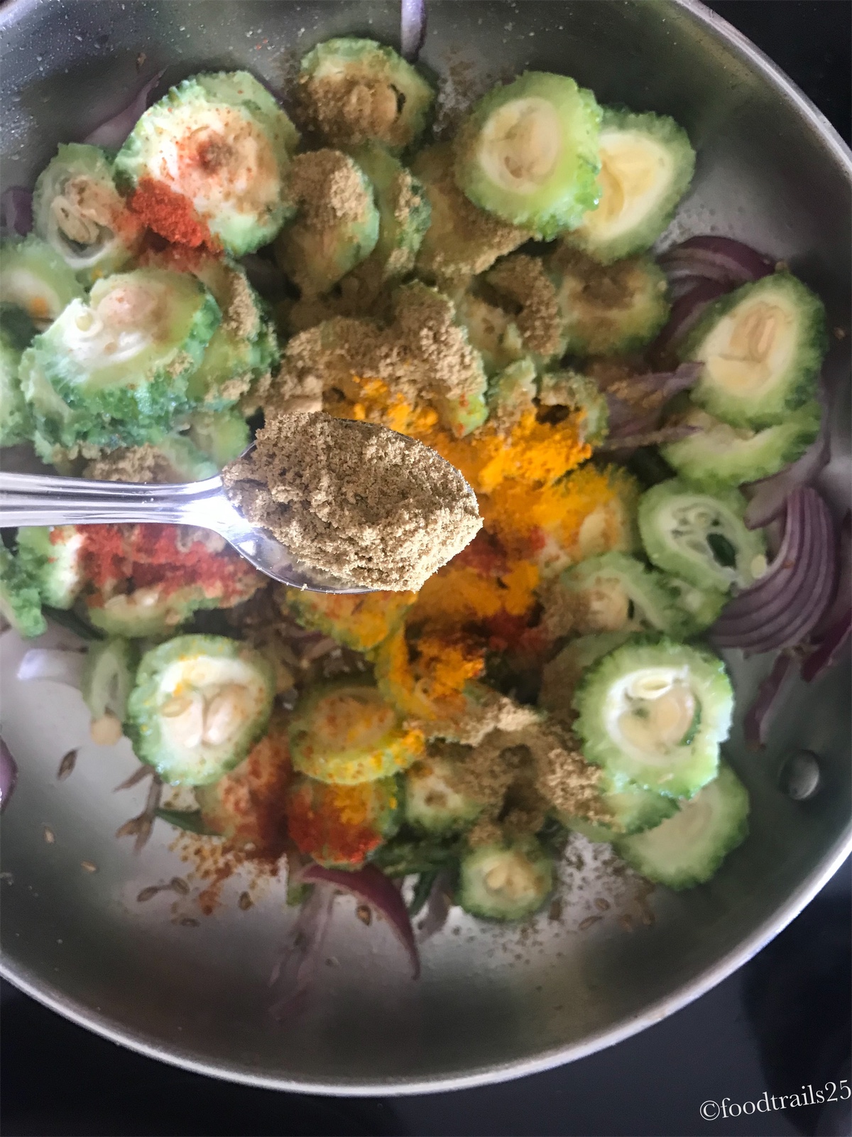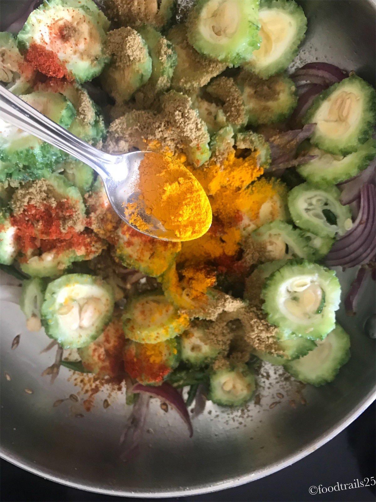 - Add all the dry spice powders except dry mango, add sliced karela pieces and with salt and mix everything. Add 1-2 tbsp of water if required, cover the pan and cook the vegetable for 5-6 minutes.