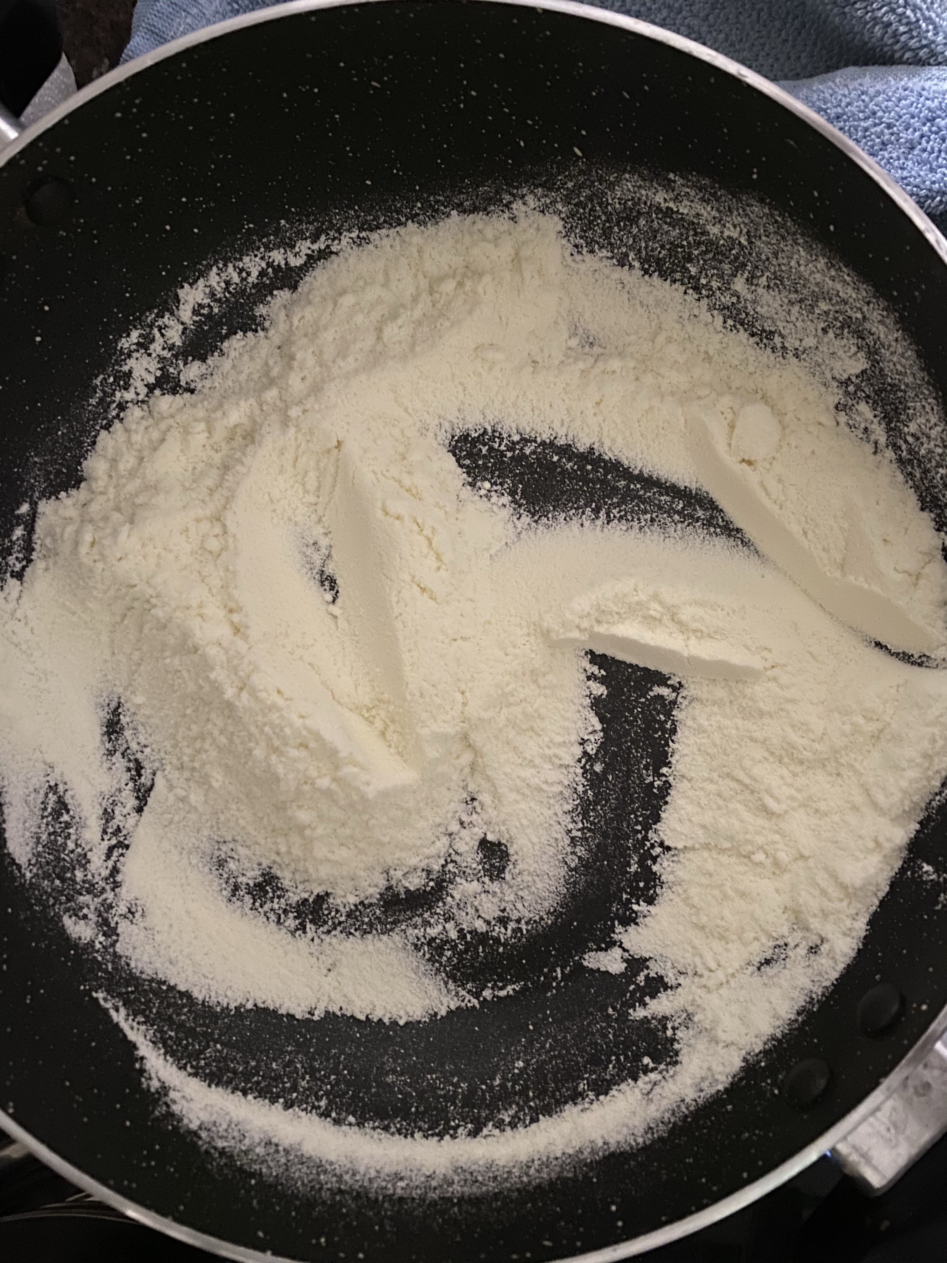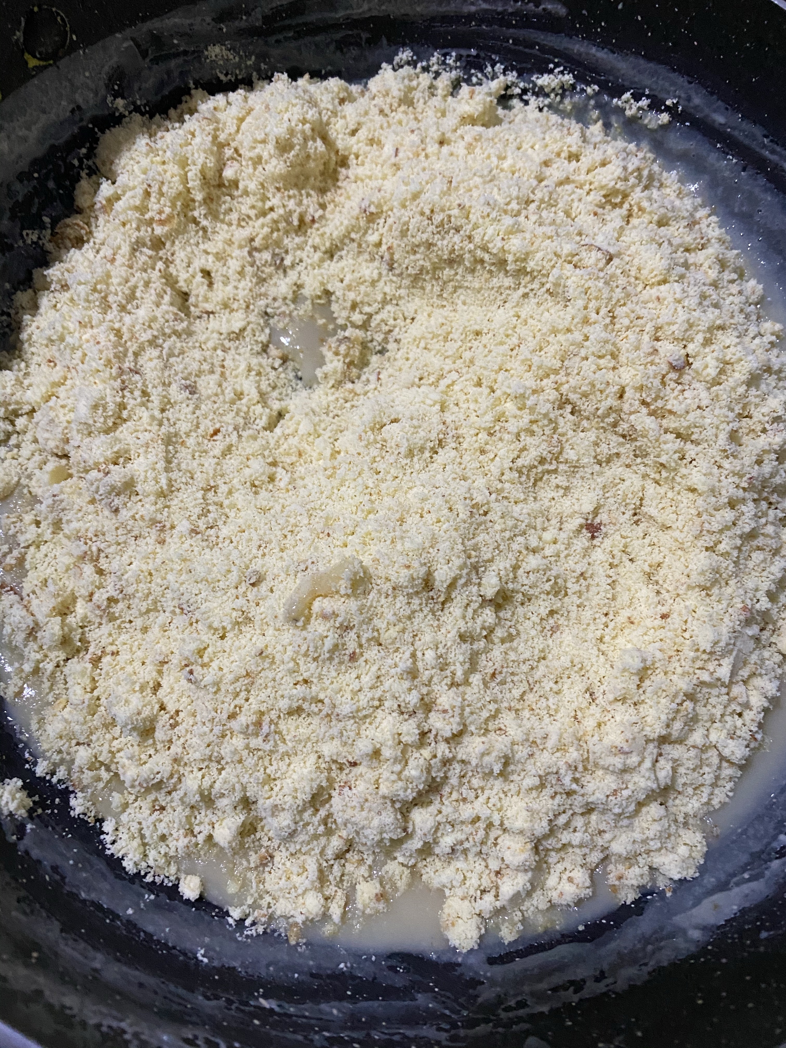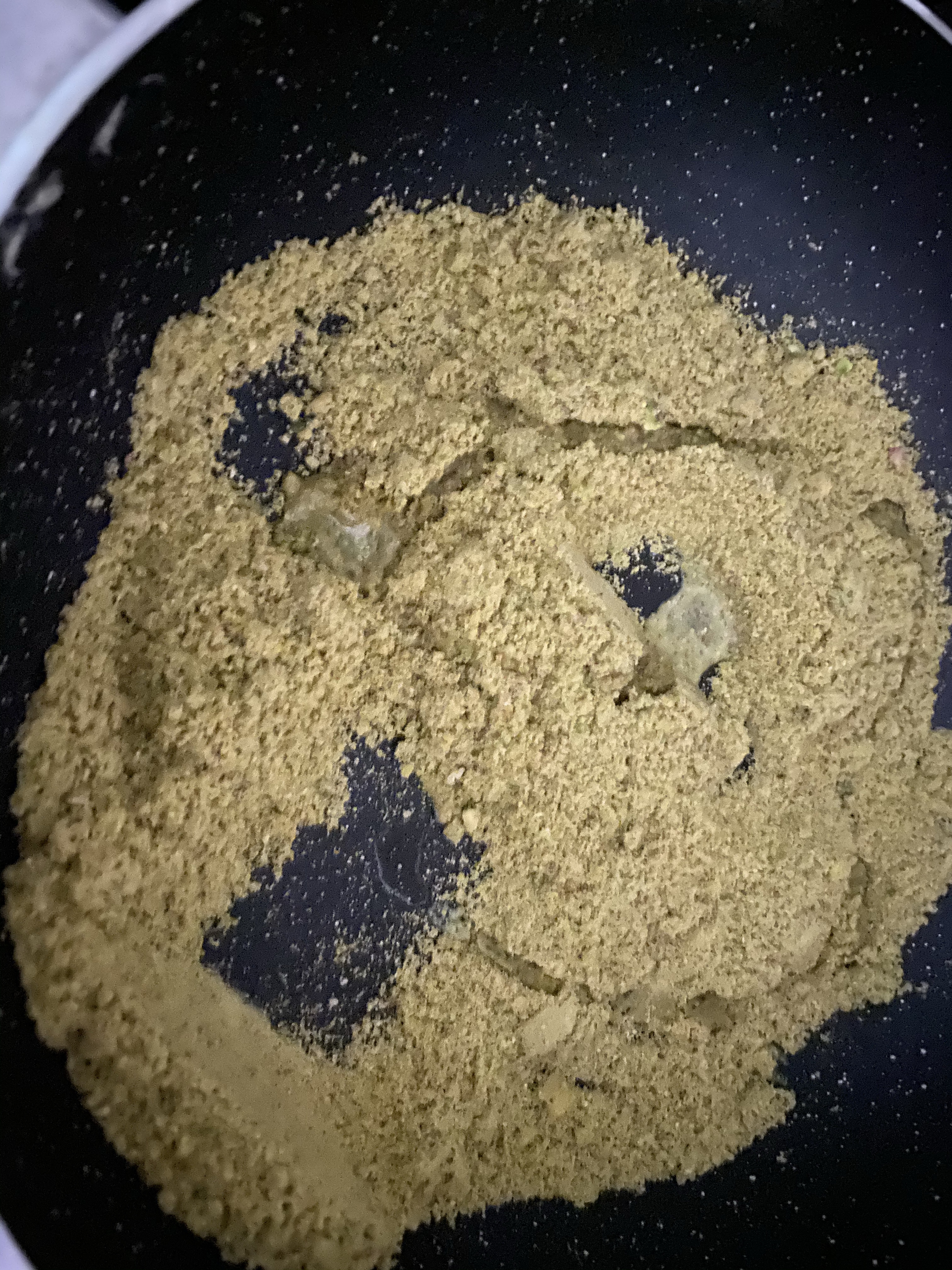 Keep the flame to medium. Roasting on high flame/heat with burn the milk powder and powdered nuts.