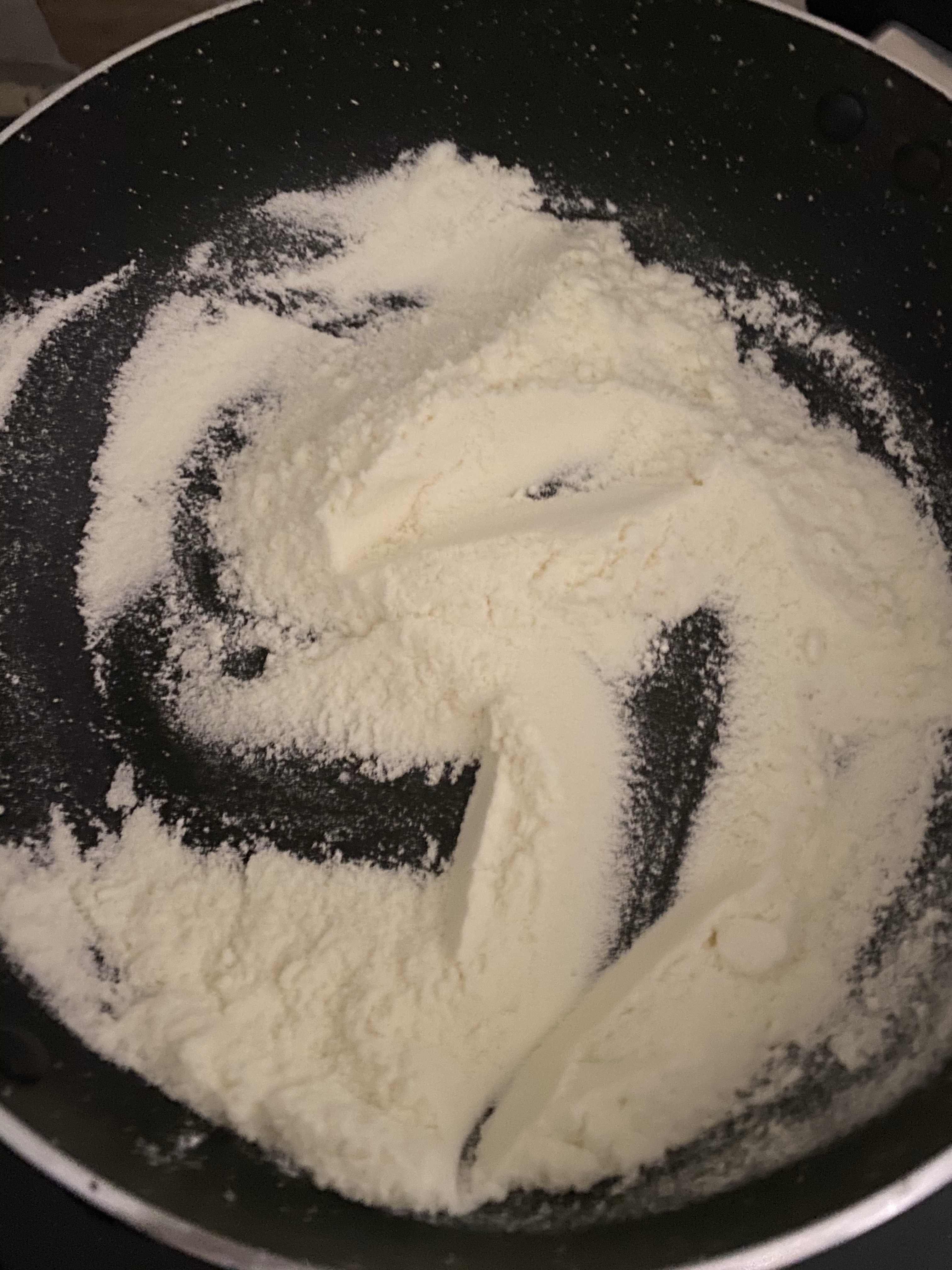 - Now take milk powder, add ghee in it and roast till milk powder turns creamy in color and gives the roasted aroma.