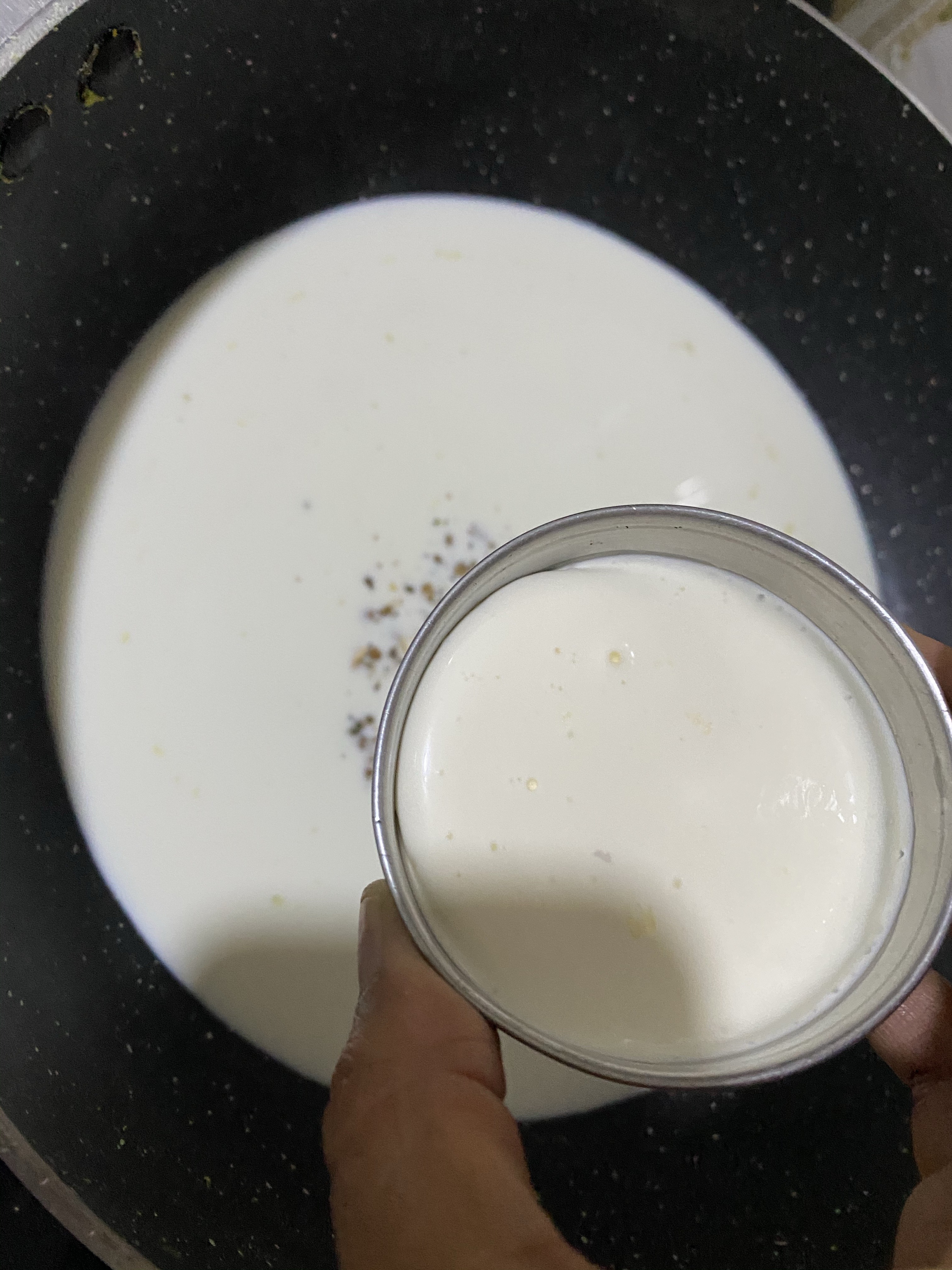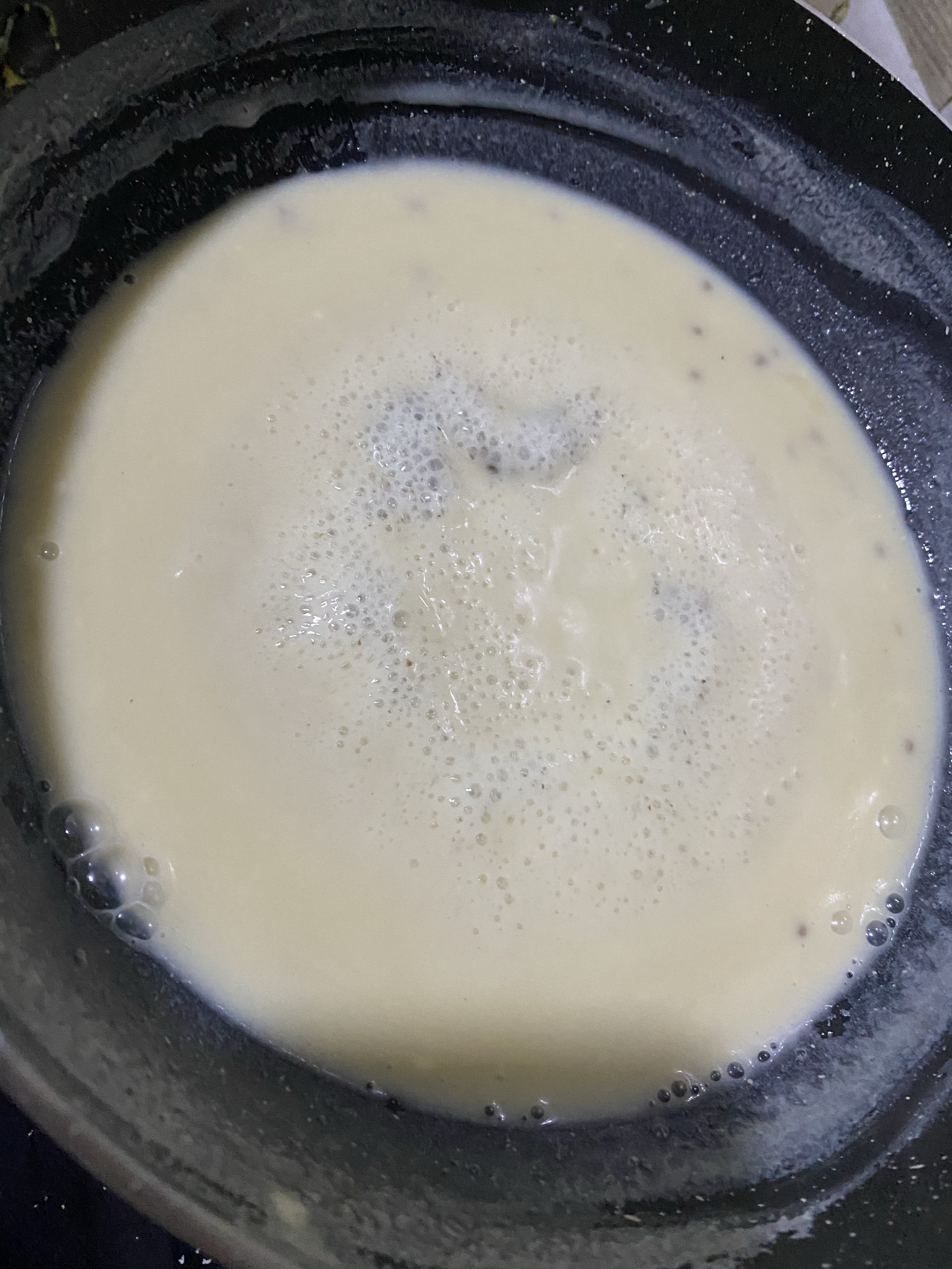 - Now in another or same pan, add rest of the milk, cardamom powder, cream, sugar and cook till milk starts to thicken. Cook for about 5 mins.