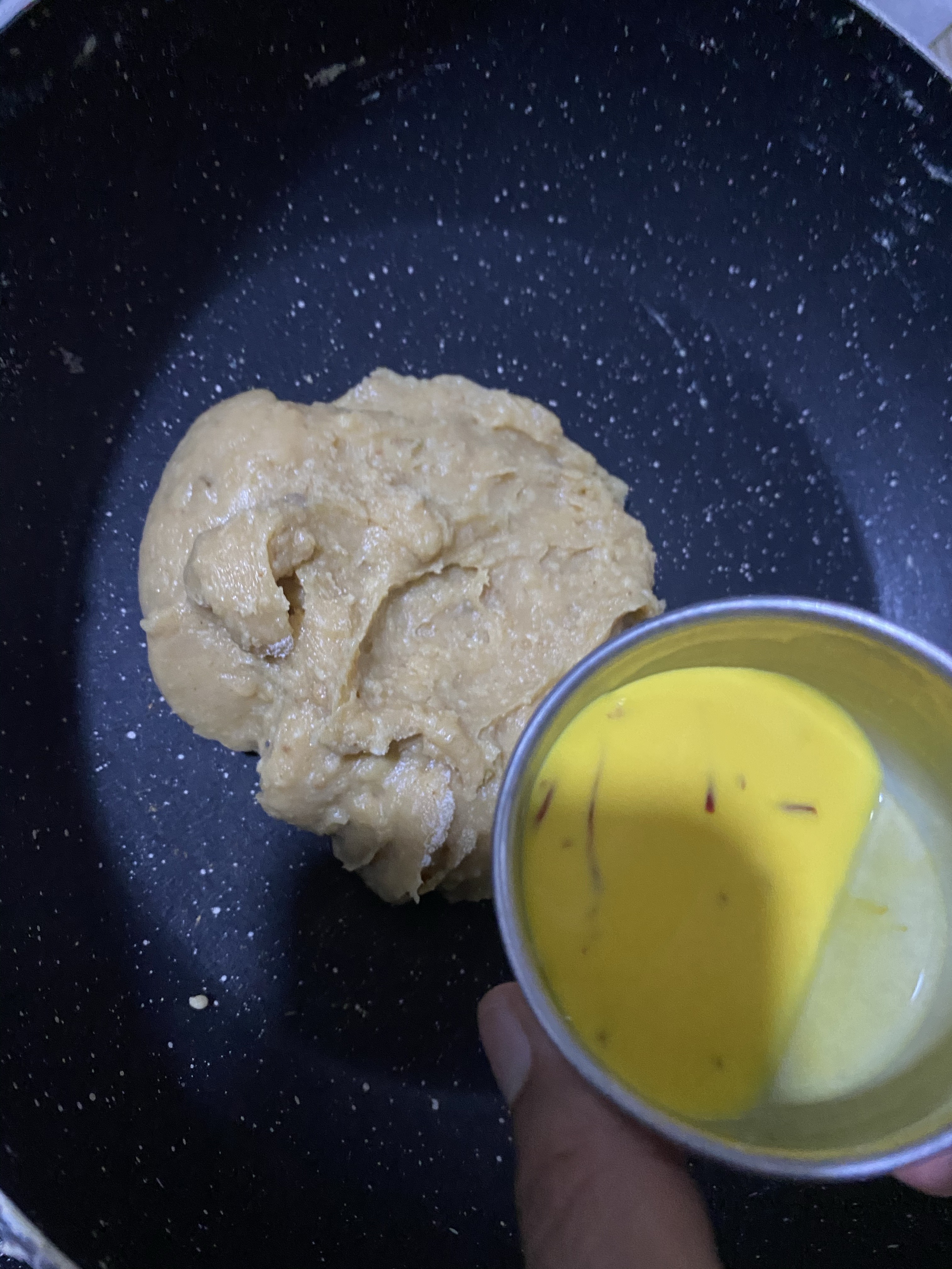 - Now add kesar milk in pan, add the rest of the portion of milk powder mix(mawa) and mix well.